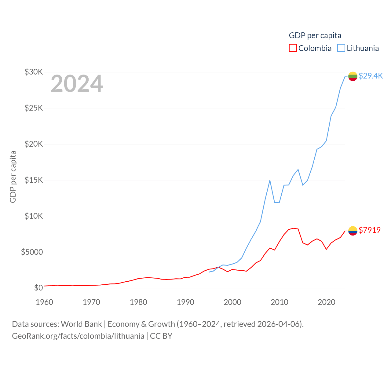 By GDP, Colombia ranks 39/197 ($419B) and Lithuania ranks 79/197 ($84.9B). By GDP per capita, Colombia ranks 94/197 ($7,919), while Lithuania ranks 43/197 ($29,384).