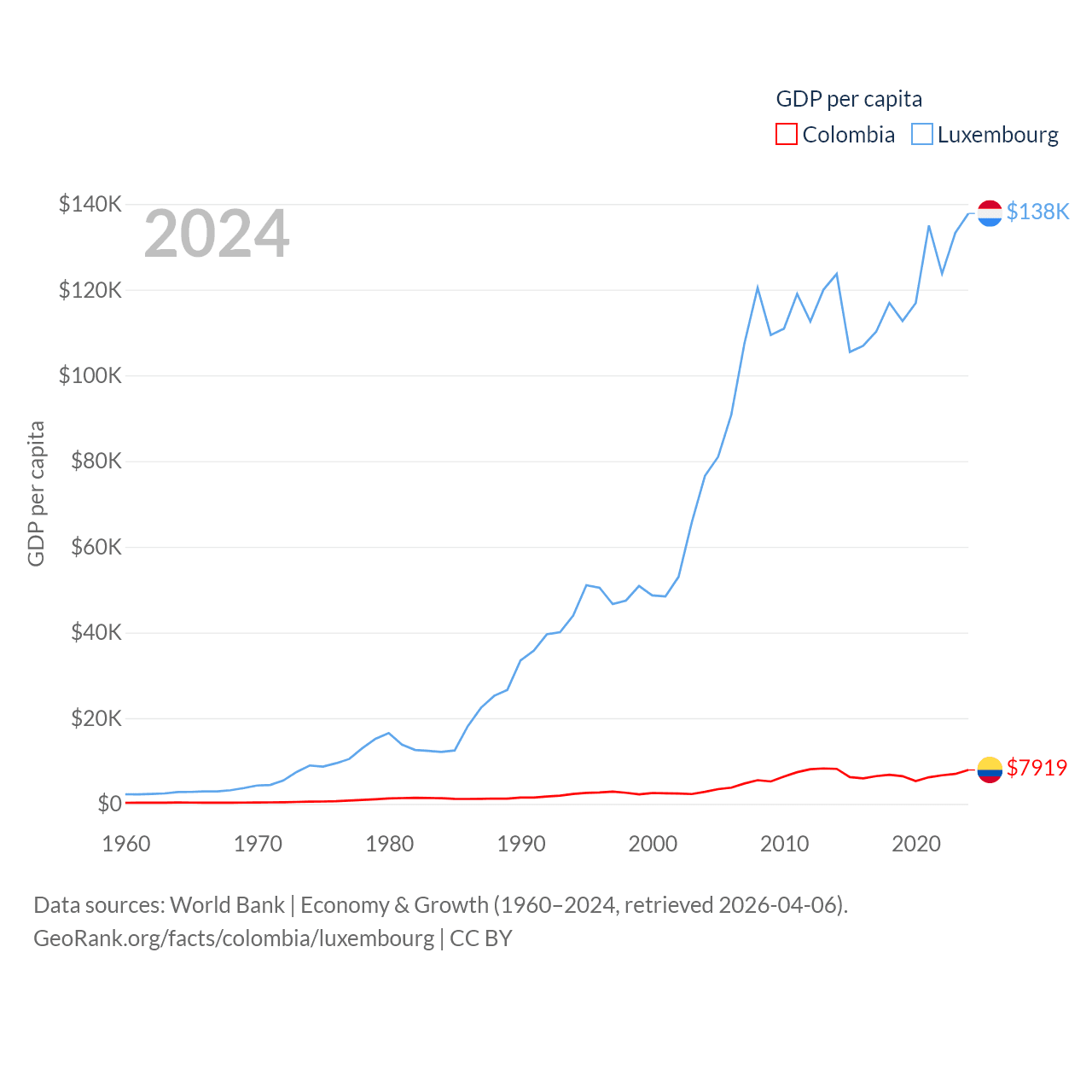By GDP, Colombia ranks 39/197 ($419B) and Luxembourg ranks 74/197 ($93.3B). By GDP per capita, Colombia ranks 94/197 ($7,919), while Luxembourg ranks 3/197 ($137,782).