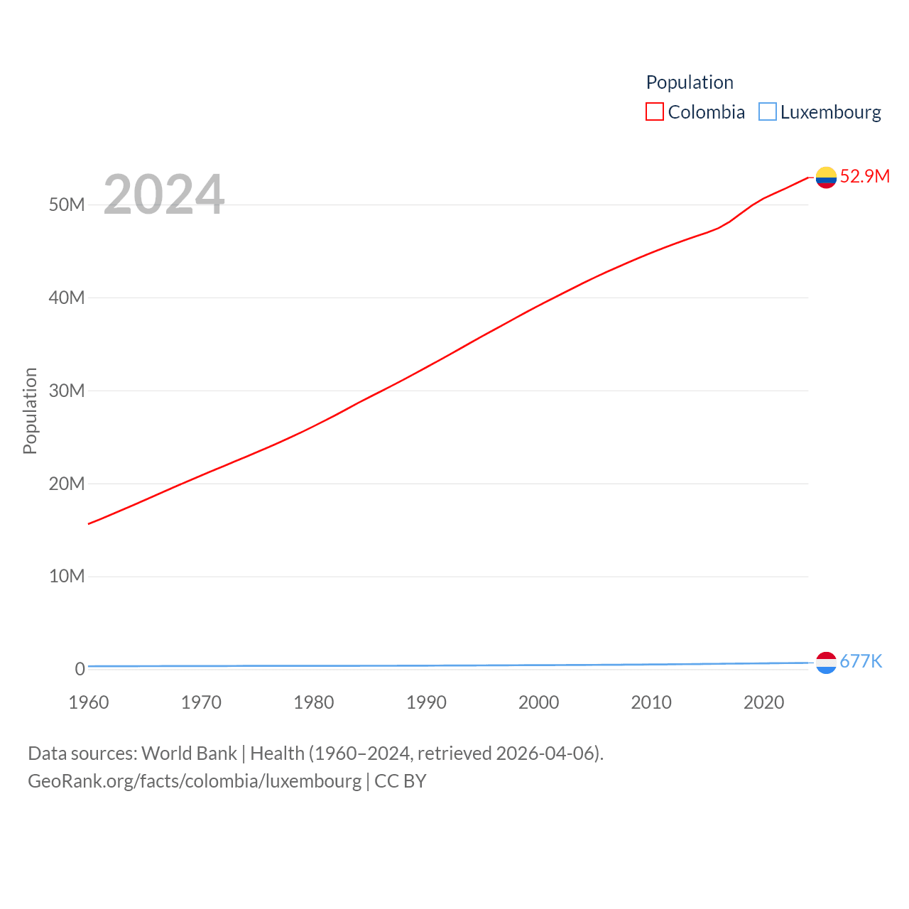 Colombia has a population of 52.9M (ranked 28/197), compared with 677K in Luxembourg (ranked 164/197). Colombia's land area is 428,380 sq mi versus 994 sq mi for Luxembourg (ranked 26th vs. 169th).