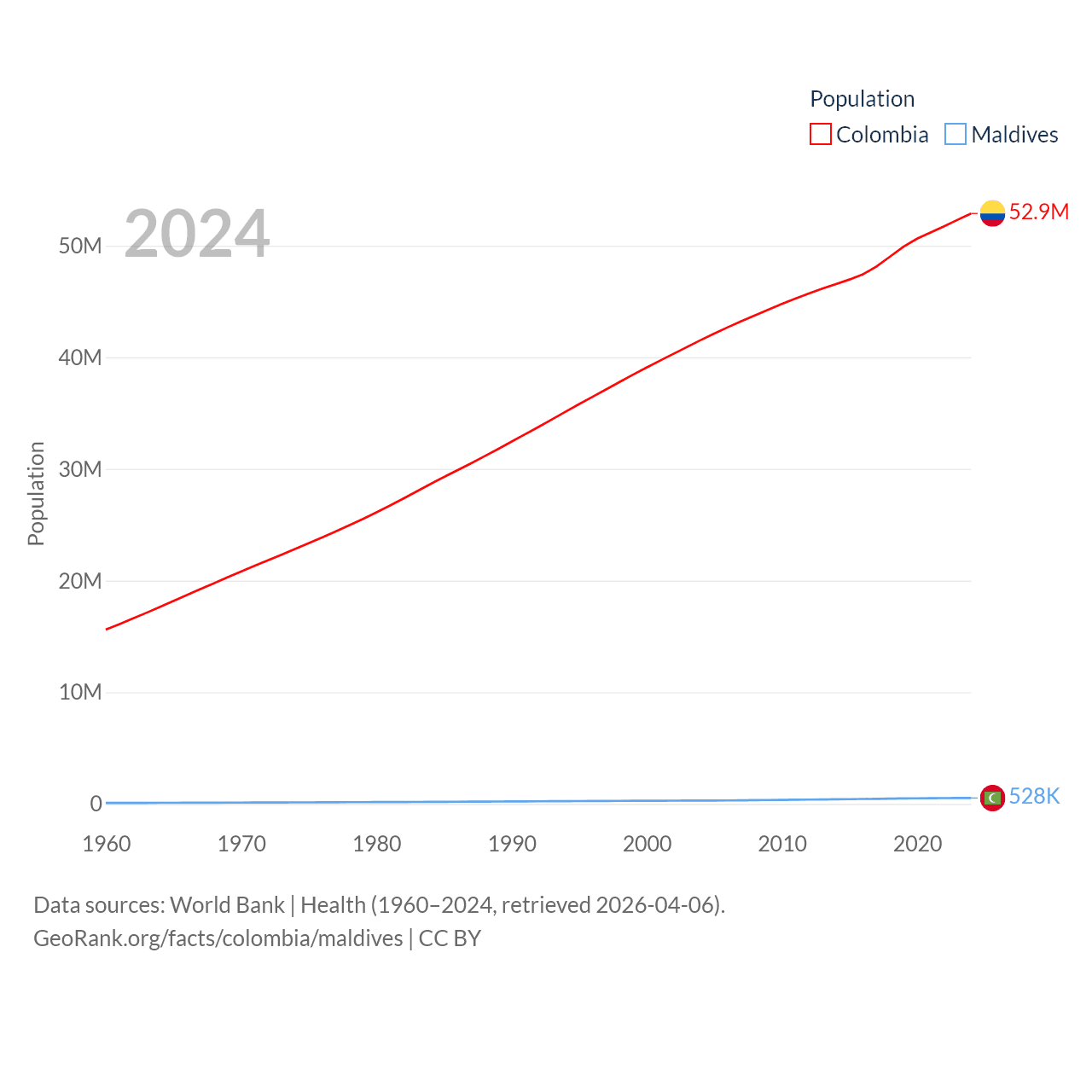 Colombia has a population of 52.9M (ranked 28/197), compared with 528K in Maldives (ranked 168/197). Colombia's land area is 428,380 sq mi versus 115.1 sq mi for Maldives (ranked 26th vs. 188th).