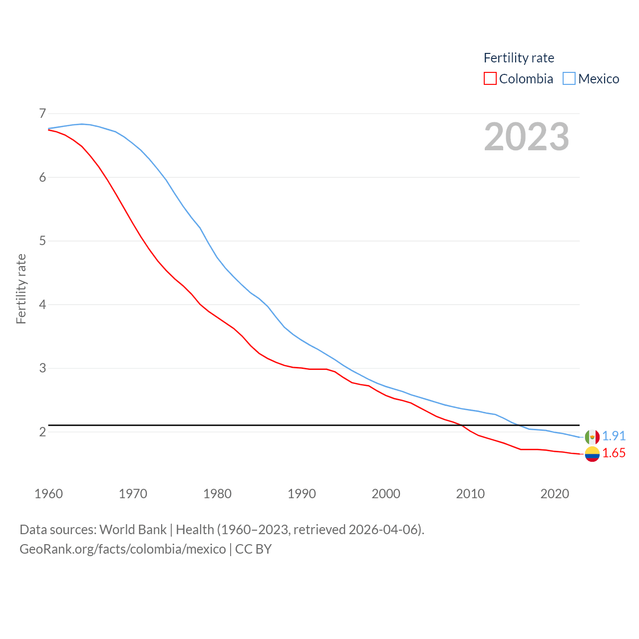 Colombia has a population of 52.9M (ranked 28/197), compared with 131M in Mexico (ranked 11/197). Colombia's land area is 428,380 sq mi versus 750,563 sq mi for Mexico (ranked 26th vs. 13th).