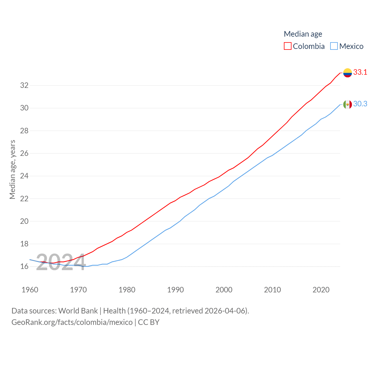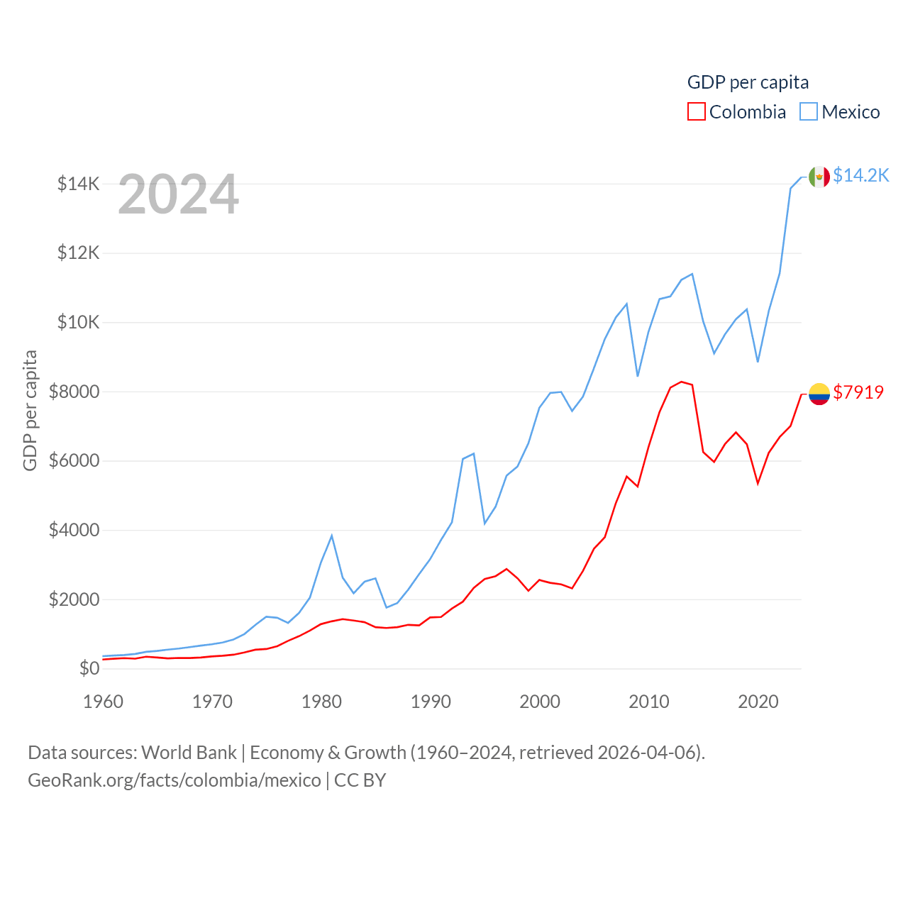 By GDP, Colombia ranks 39/197 ($419B) and Mexico ranks 13/197 ($1.86T). By GDP per capita, Colombia ranks 94/197 ($7,919), while Mexico ranks 69/197 ($14,186).