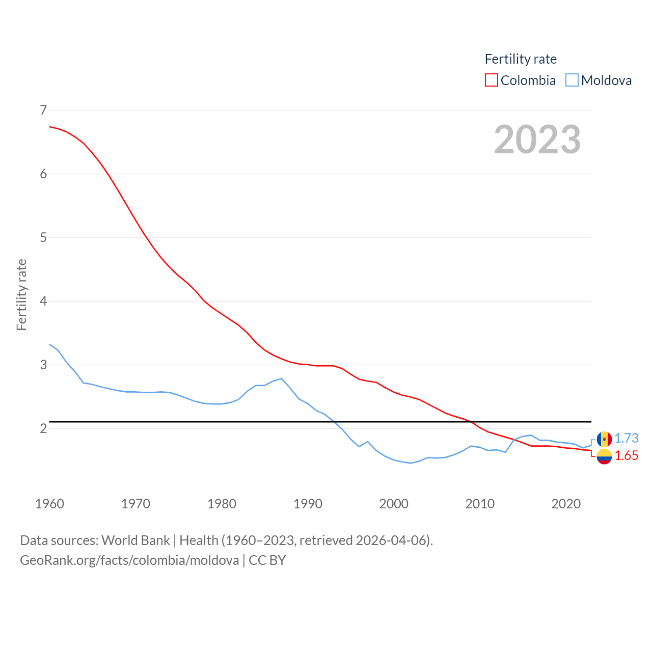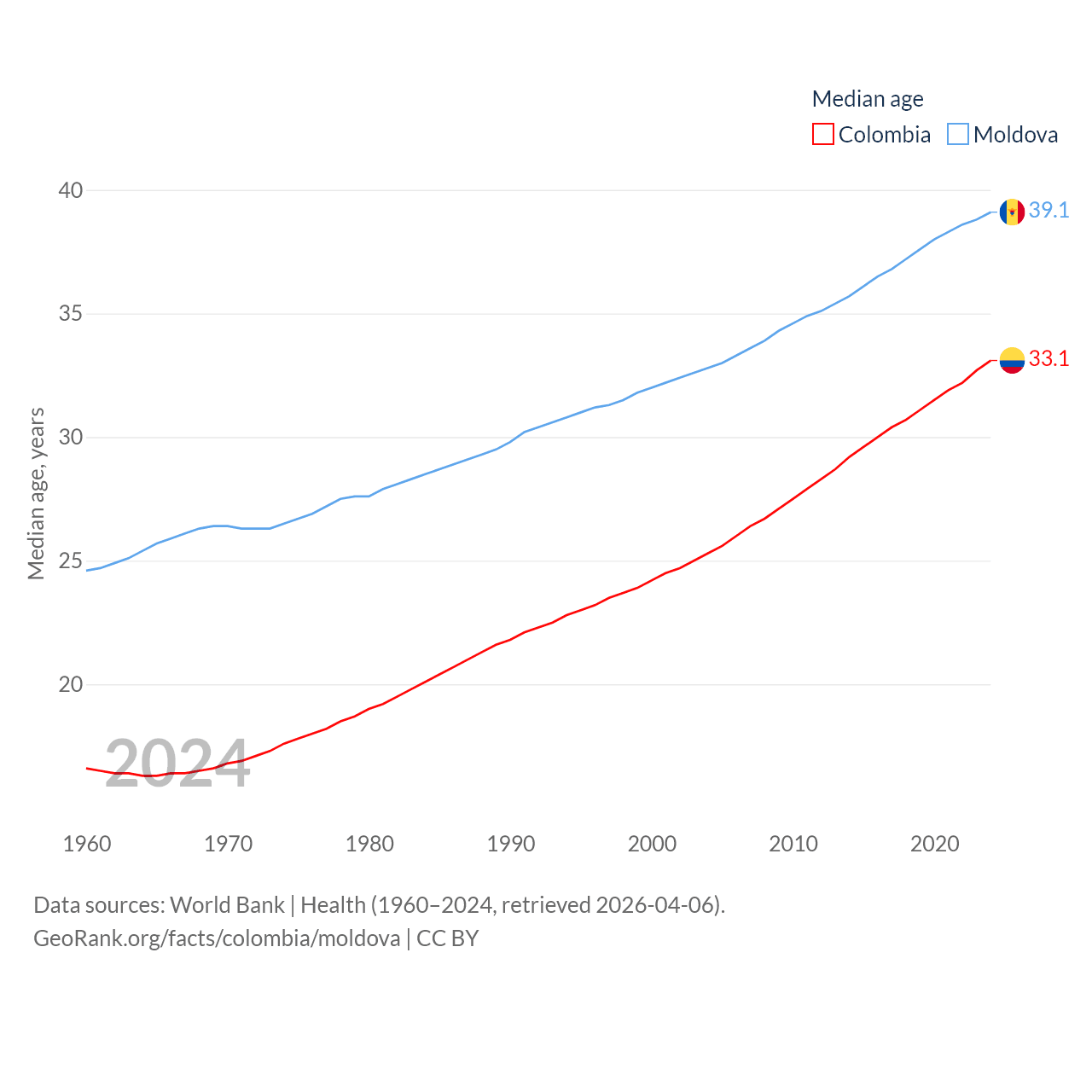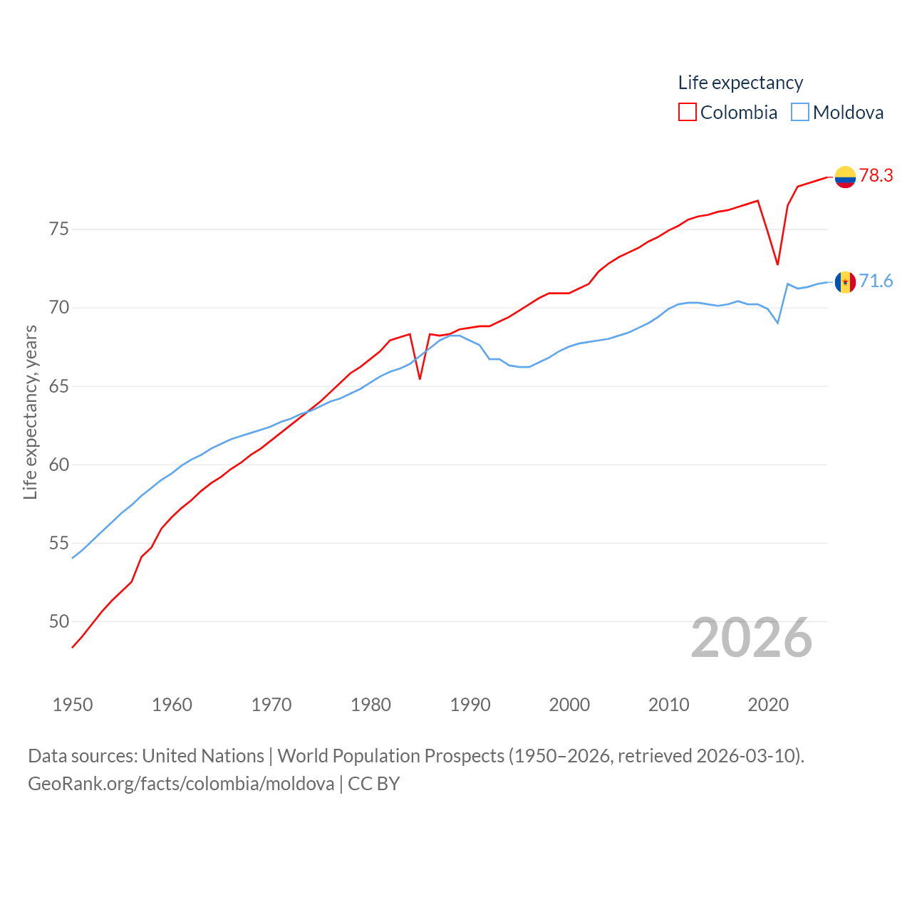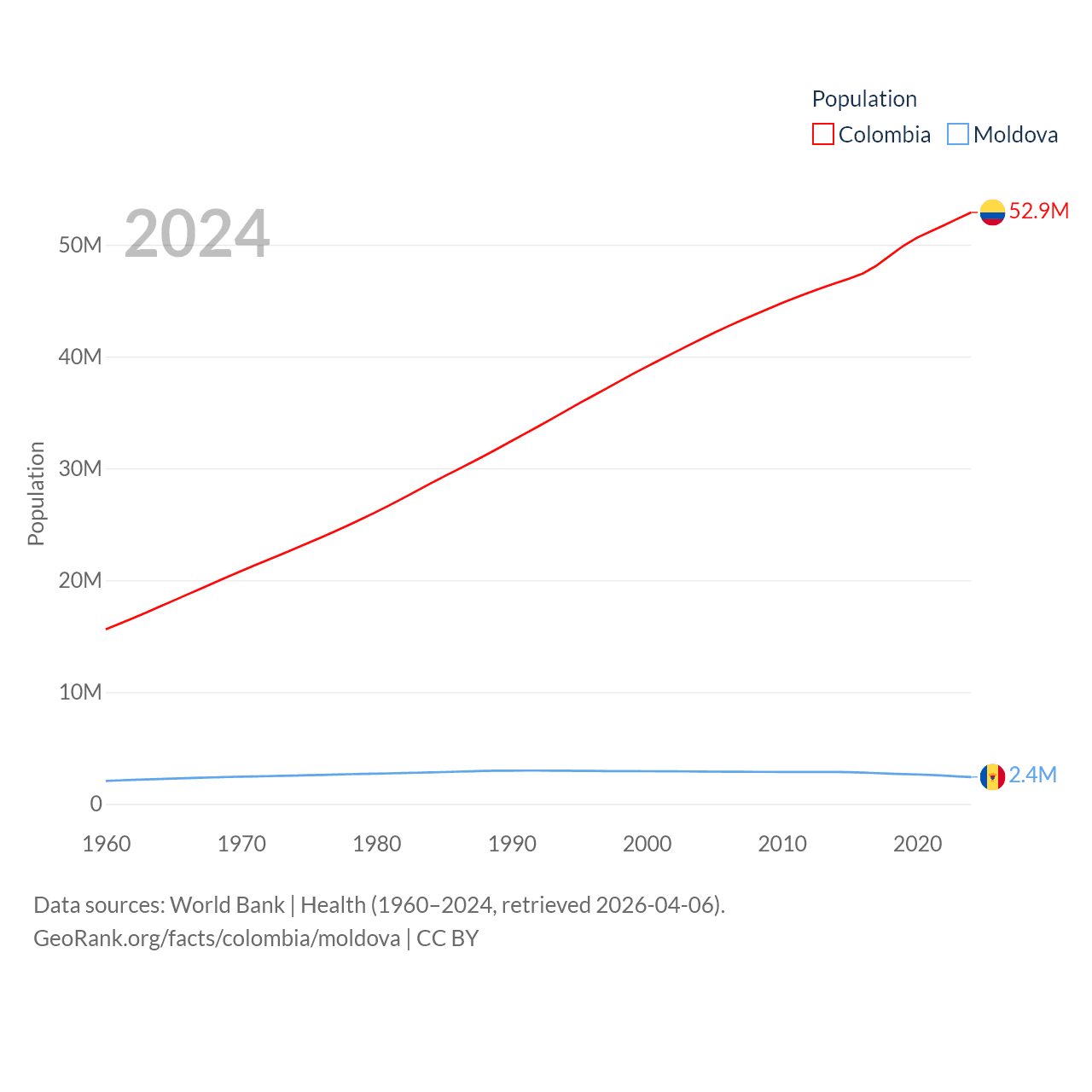 Colombia has a population of 52.9M (ranked 28/197), compared with 2.4M in Moldova (ranked 143/197). Colombia's land area is 428,380 sq mi versus 12,714 sq mi for Moldova (ranked 26th vs. 135th).