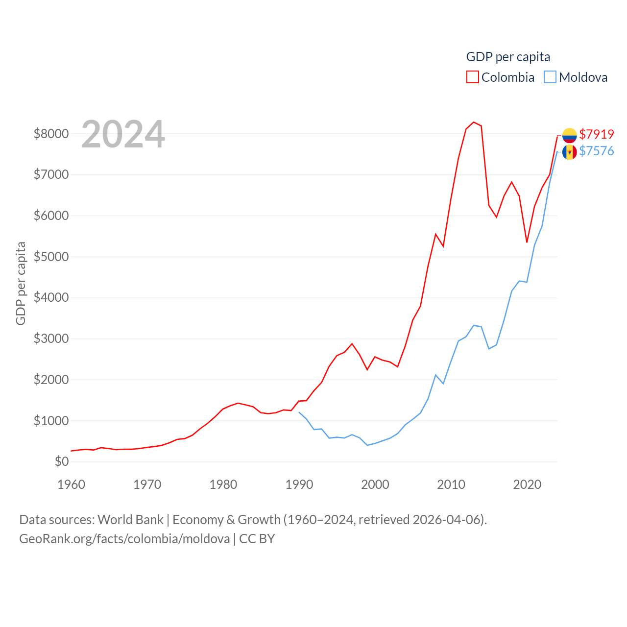 By GDP, Colombia ranks 39/197 ($419B) and Moldova ranks 134/197 ($18.2B). By GDP per capita, Colombia ranks 94/197 ($7,919), while Moldova ranks 99/197 ($7,576).