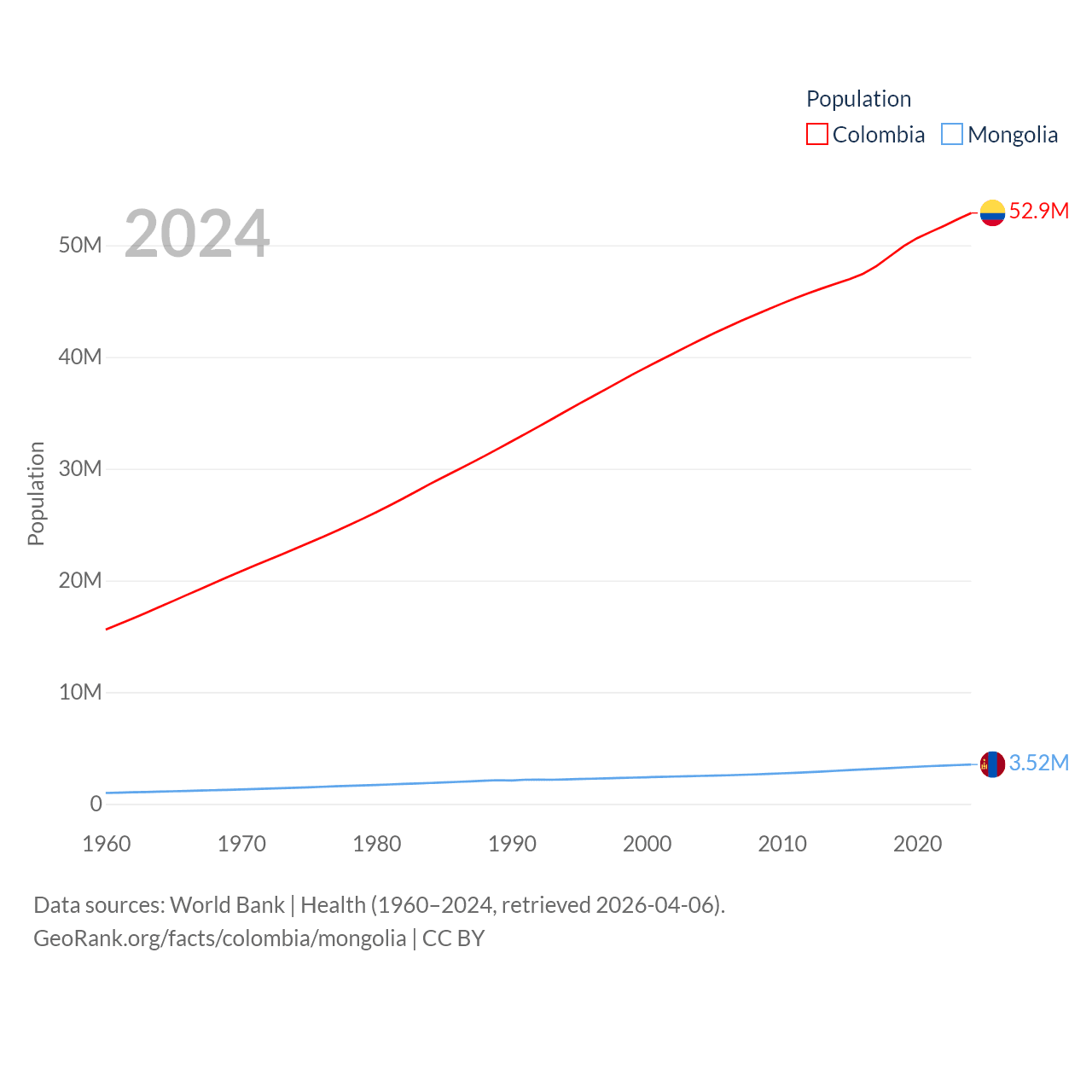 Colombia has a population of 52.9M (ranked 28/197), compared with 3.52M in Mongolia (ranked 132/197). Colombia's land area is 428,380 sq mi versus 601,740 sq mi for Mongolia (ranked 26th vs. 18th).