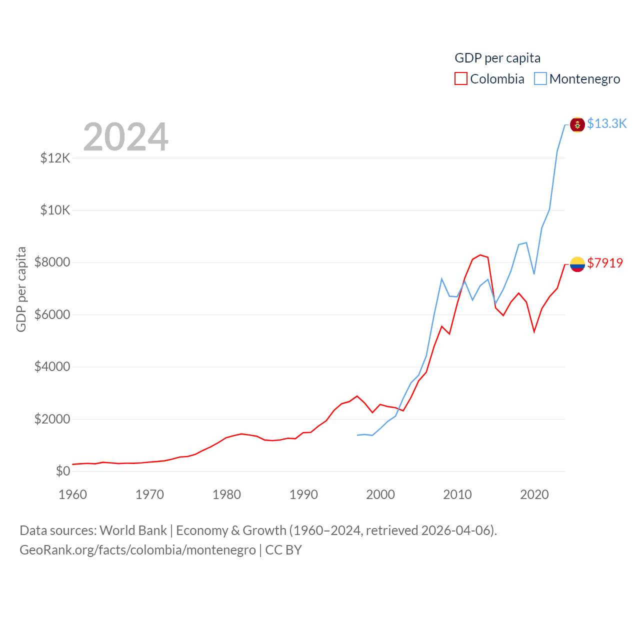 By GDP, Colombia ranks 39/197 ($419B) and Montenegro ranks 155/197 ($8.27B). By GDP per capita, Colombia ranks 94/197 ($7,919), while Montenegro ranks 77/197 ($13,263).