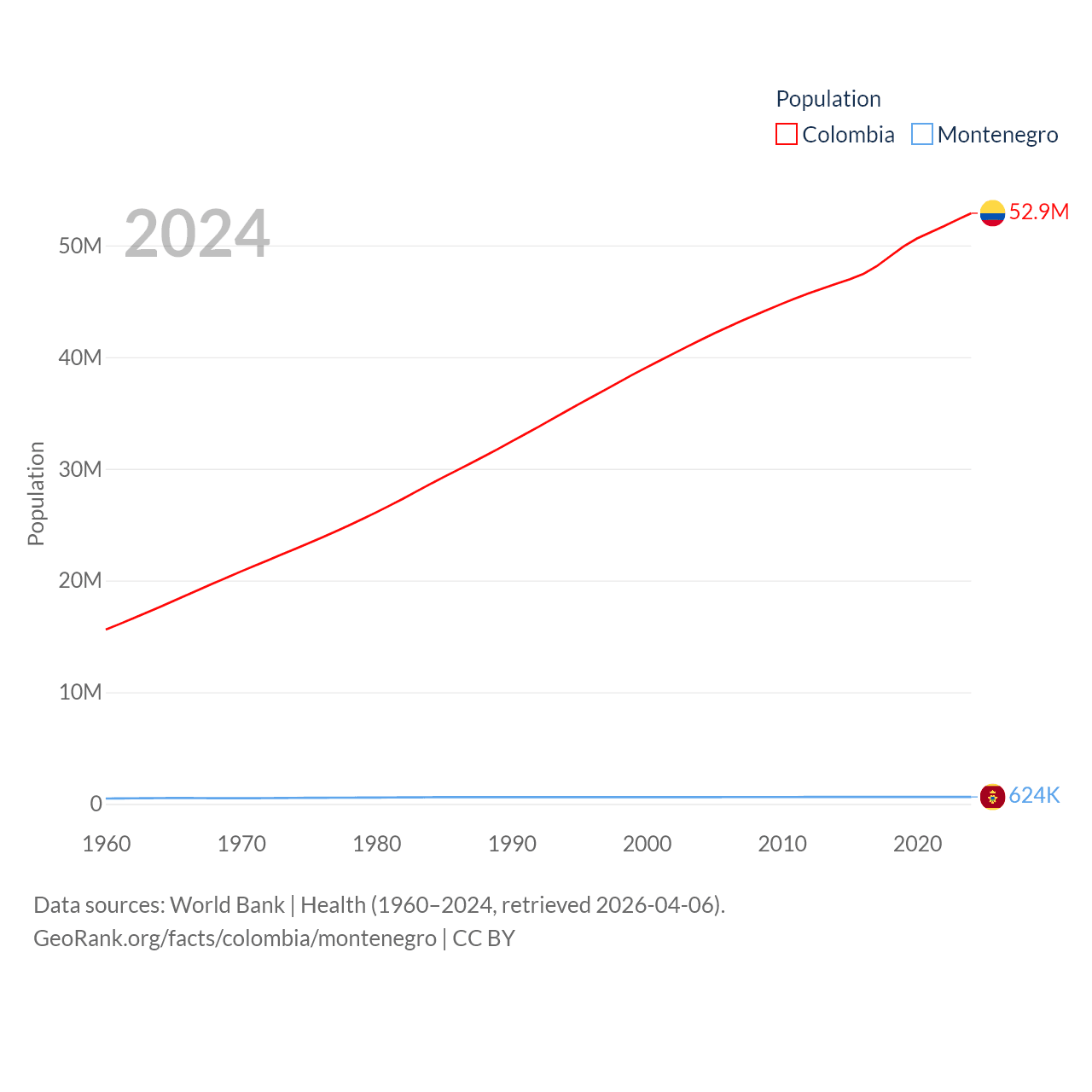 Colombia has a population of 52.9M (ranked 28/197), compared with 624K in Montenegro (ranked 166/197). Colombia's land area is 428,380 sq mi versus 5,193 sq mi for Montenegro (ranked 26th vs. 156th).