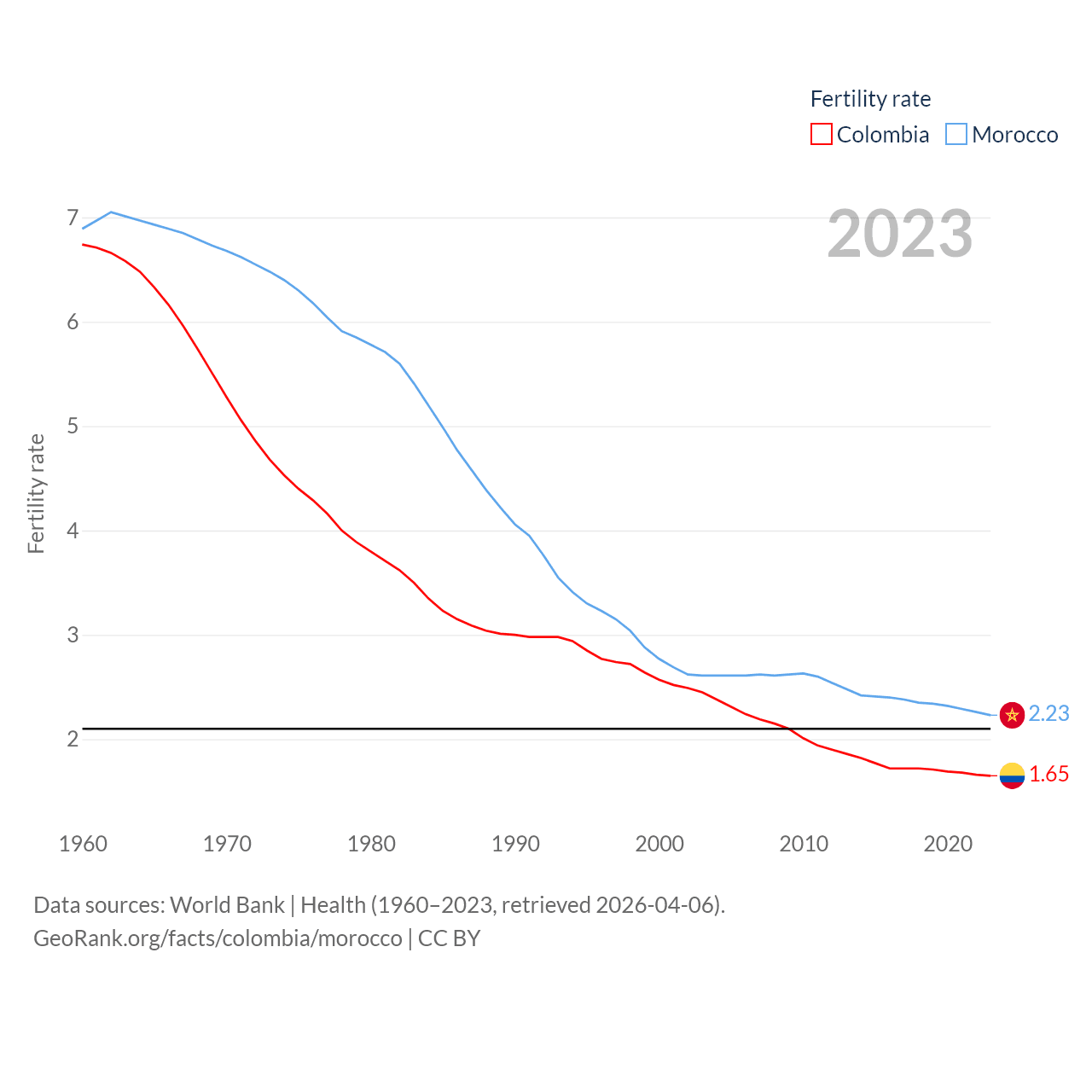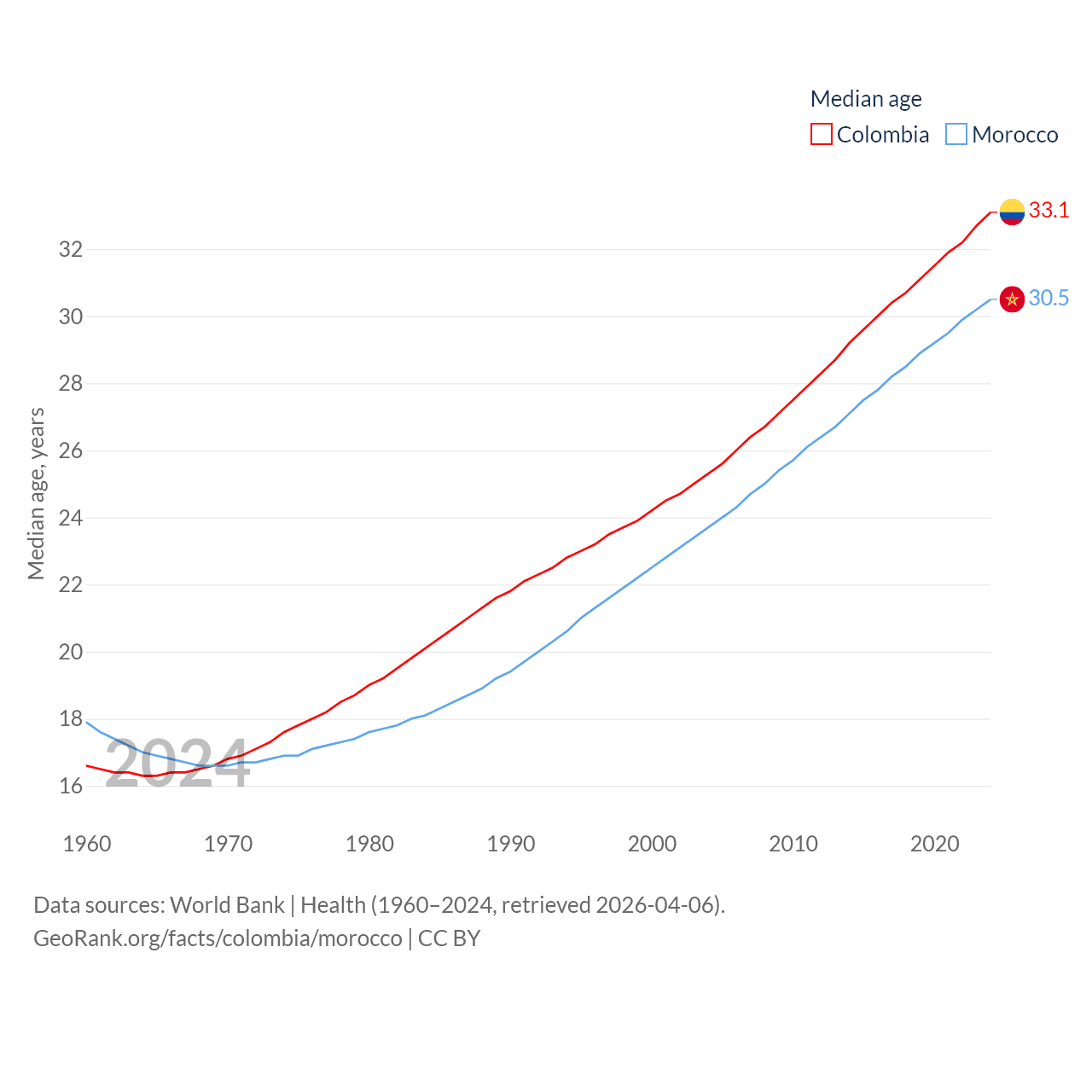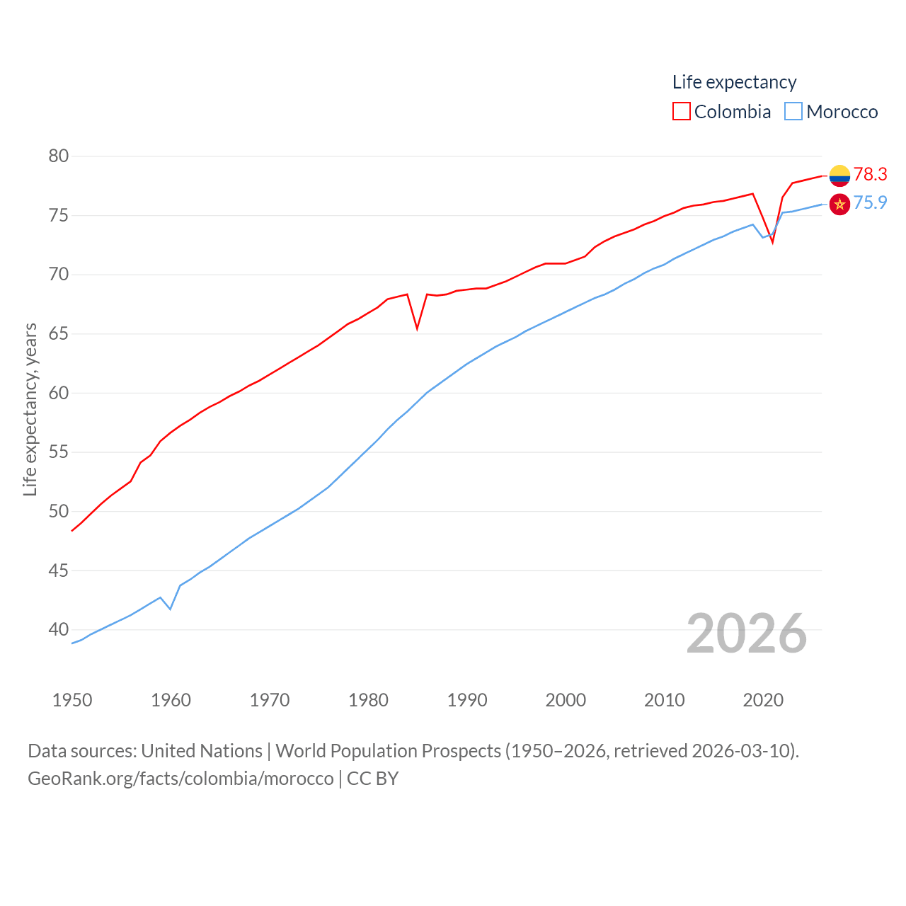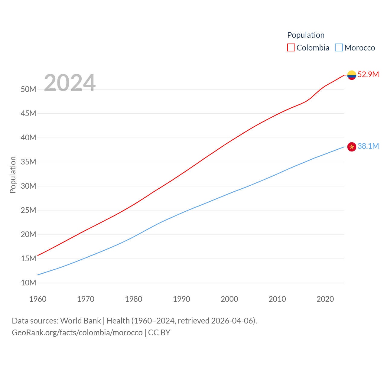 Colombia has a population of 52.9M (ranked 28/197), compared with 38.1M in Morocco (ranked 39/197). Colombia's land area is 428,380 sq mi versus 172,317 sq mi for Morocco (ranked 26th vs. 55th).