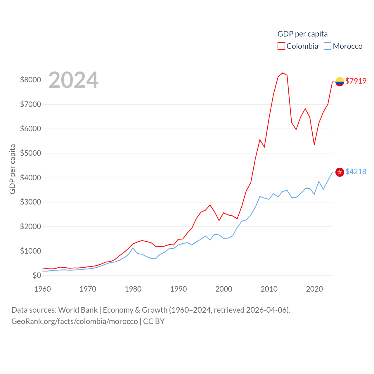 By GDP, Colombia ranks 39/197 ($419B) and Morocco ranks 58/197 ($161B). By GDP per capita, Colombia ranks 94/197 ($7,919), while Morocco ranks 127/197 ($4,218).