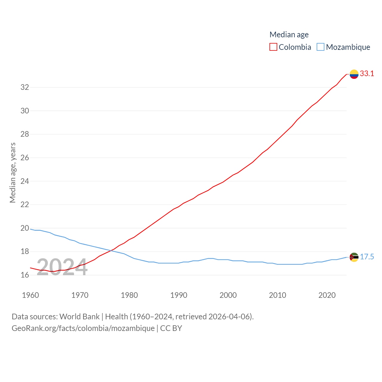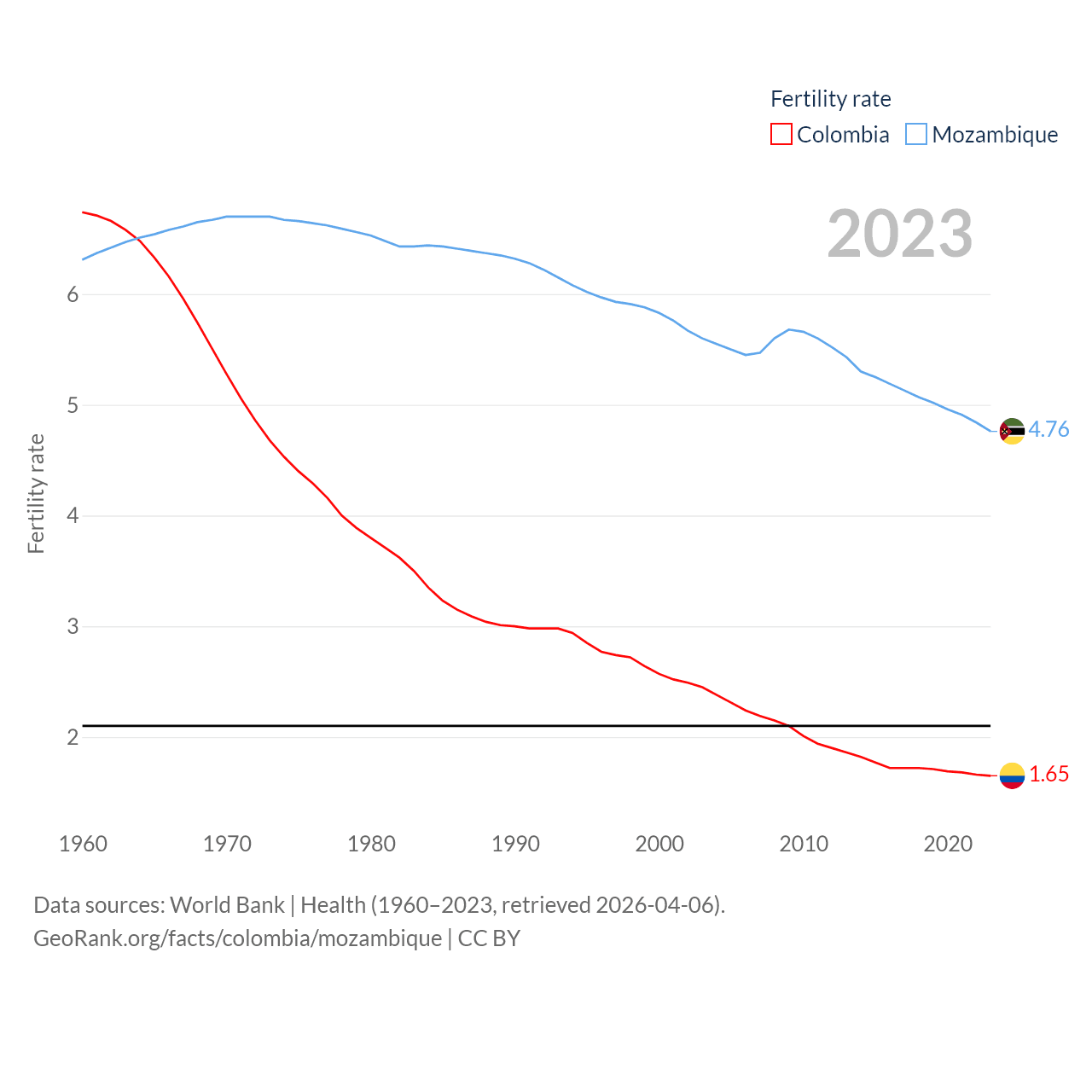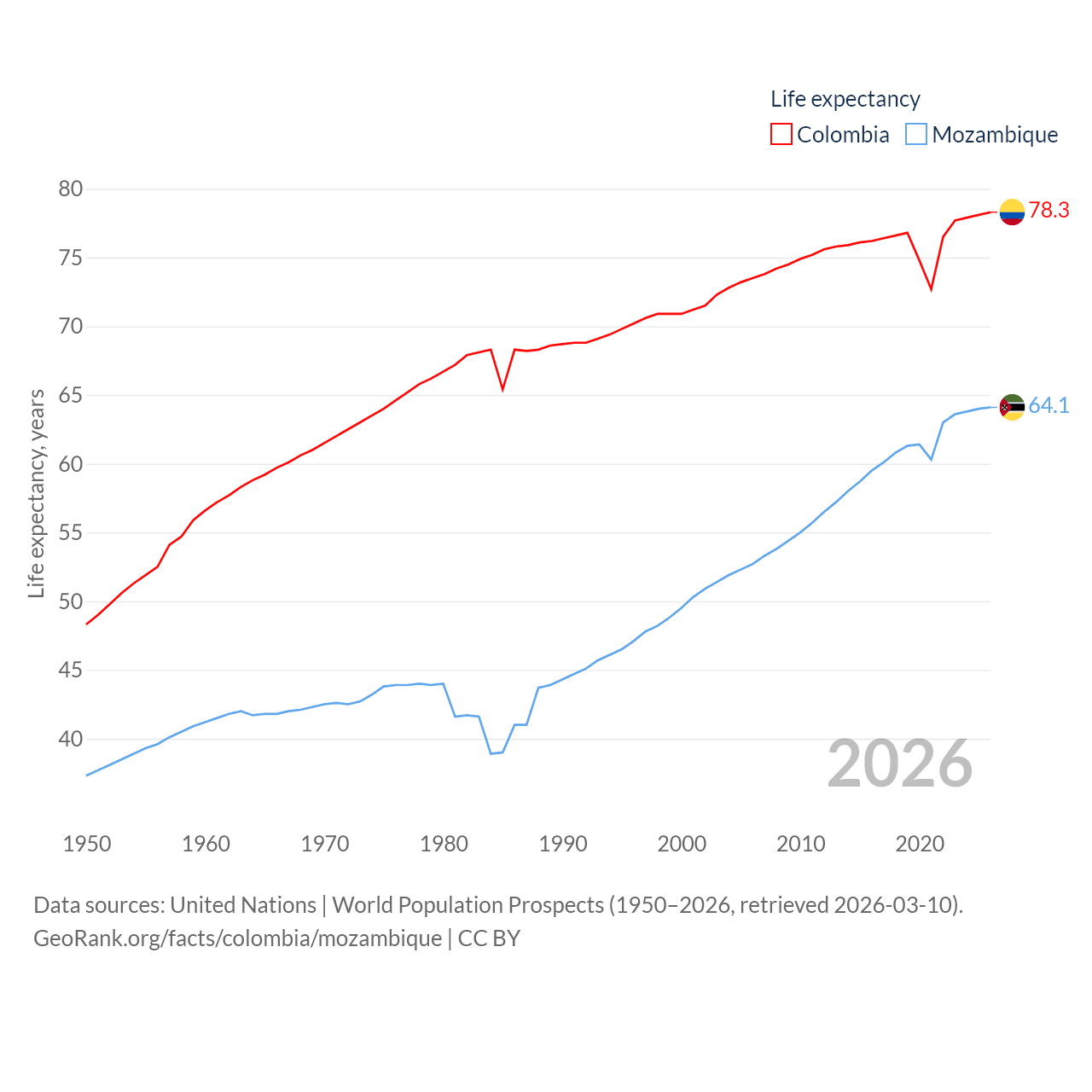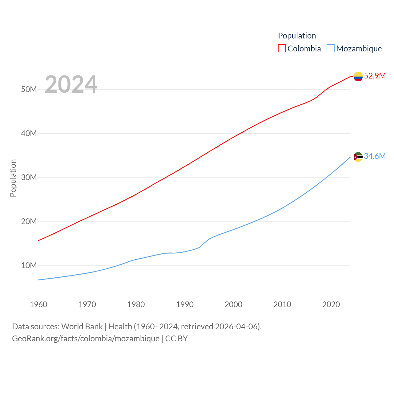 Colombia has a population of 52.9M (ranked 28/197), compared with 34.6M in Mozambique (ranked 46/197). Colombia's land area is 428,380 sq mi versus 303,623 sq mi for Mozambique (ranked 26th vs. 34th).