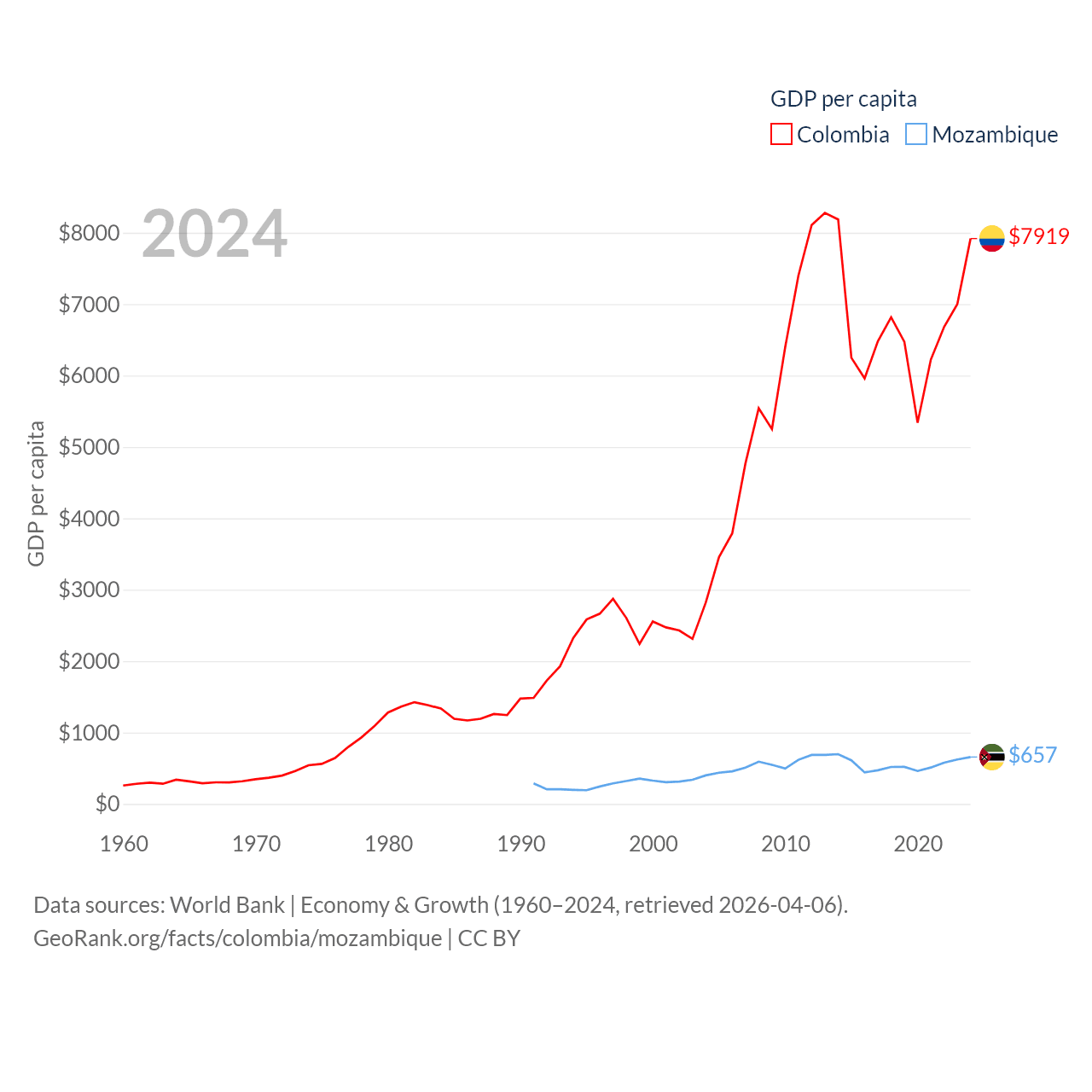 By GDP, Colombia ranks 39/197 ($419B) and Mozambique ranks 123/197 ($22.7B). By GDP per capita, Colombia ranks 94/197 ($7,919), while Mozambique ranks 189/197 ($657).