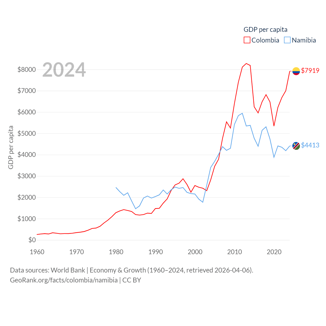 By GDP, Colombia ranks 39/197 ($419B) and Namibia ranks 147/197 ($13.4B). By GDP per capita, Colombia ranks 94/197 ($7,919), while Namibia ranks 126/197 ($4,413).