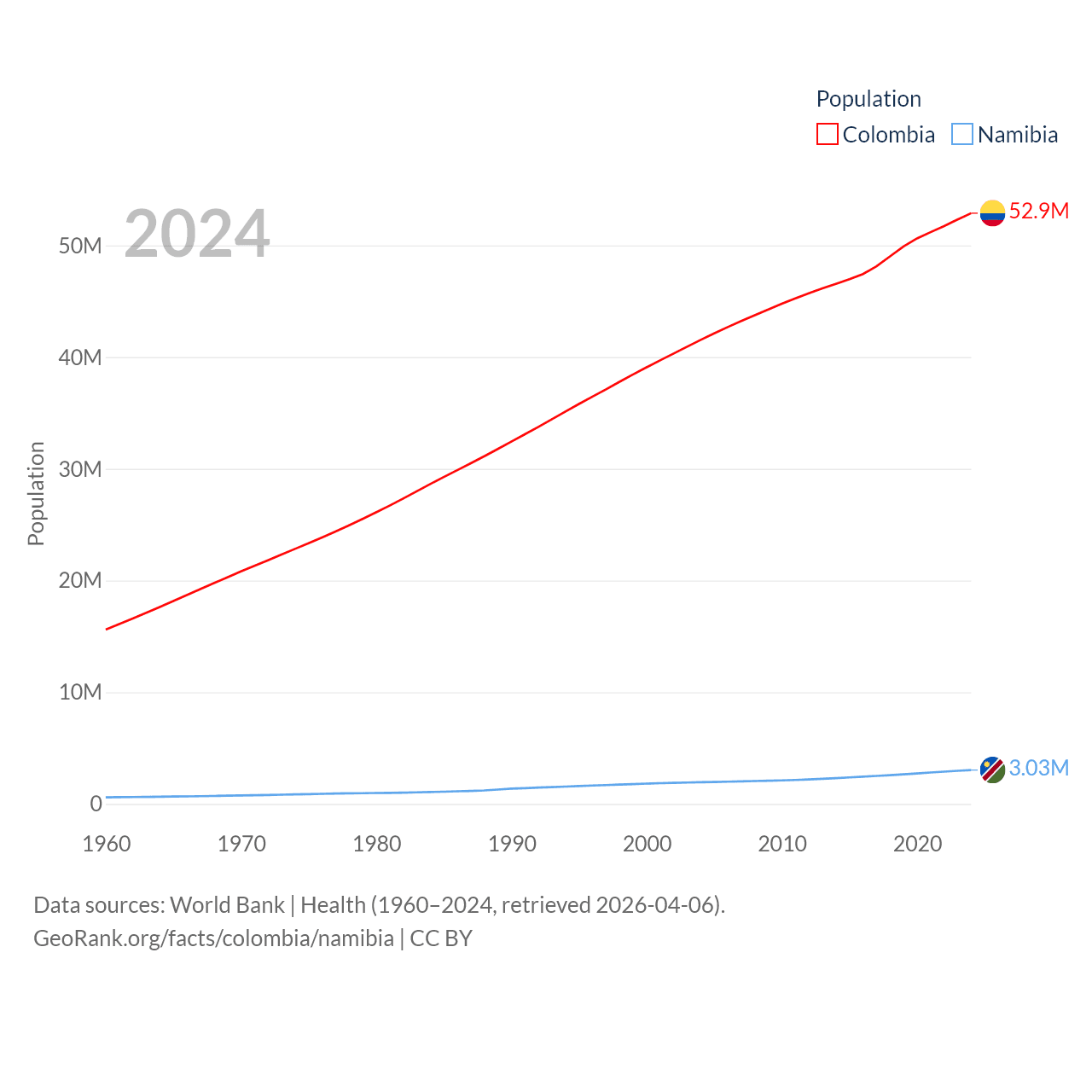 Colombia has a population of 52.9M (ranked 28/197), compared with 3.03M in Namibia (ranked 136/197). Colombia's land area is 428,380 sq mi versus 317,874 sq mi for Namibia (ranked 26th vs. 33rd).