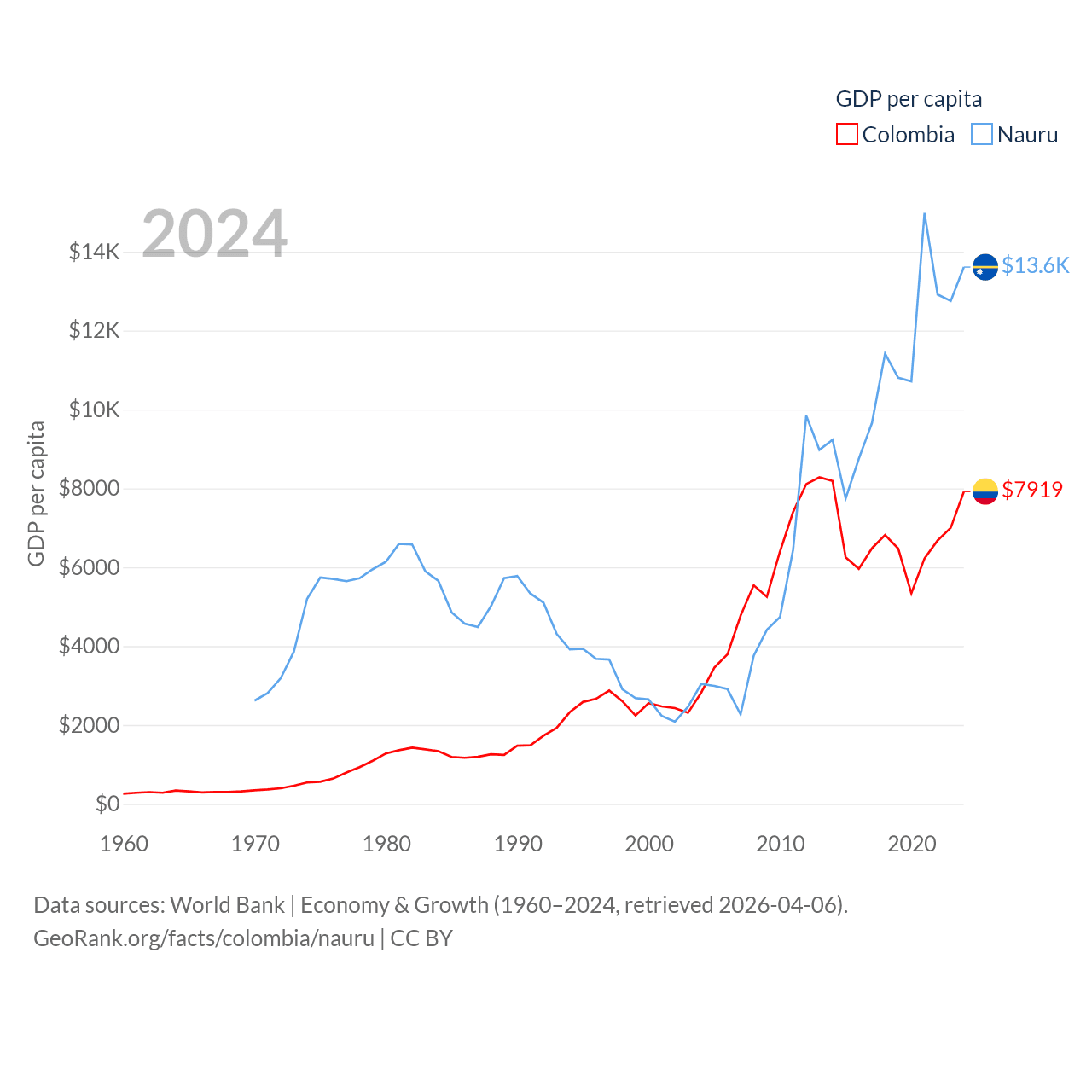 By GDP, Colombia ranks 39/197 ($419B) and Nauru ranks 195/197 ($163M). By GDP per capita, Colombia ranks 94/197 ($7,919), while Nauru ranks 74/197 ($13,609).