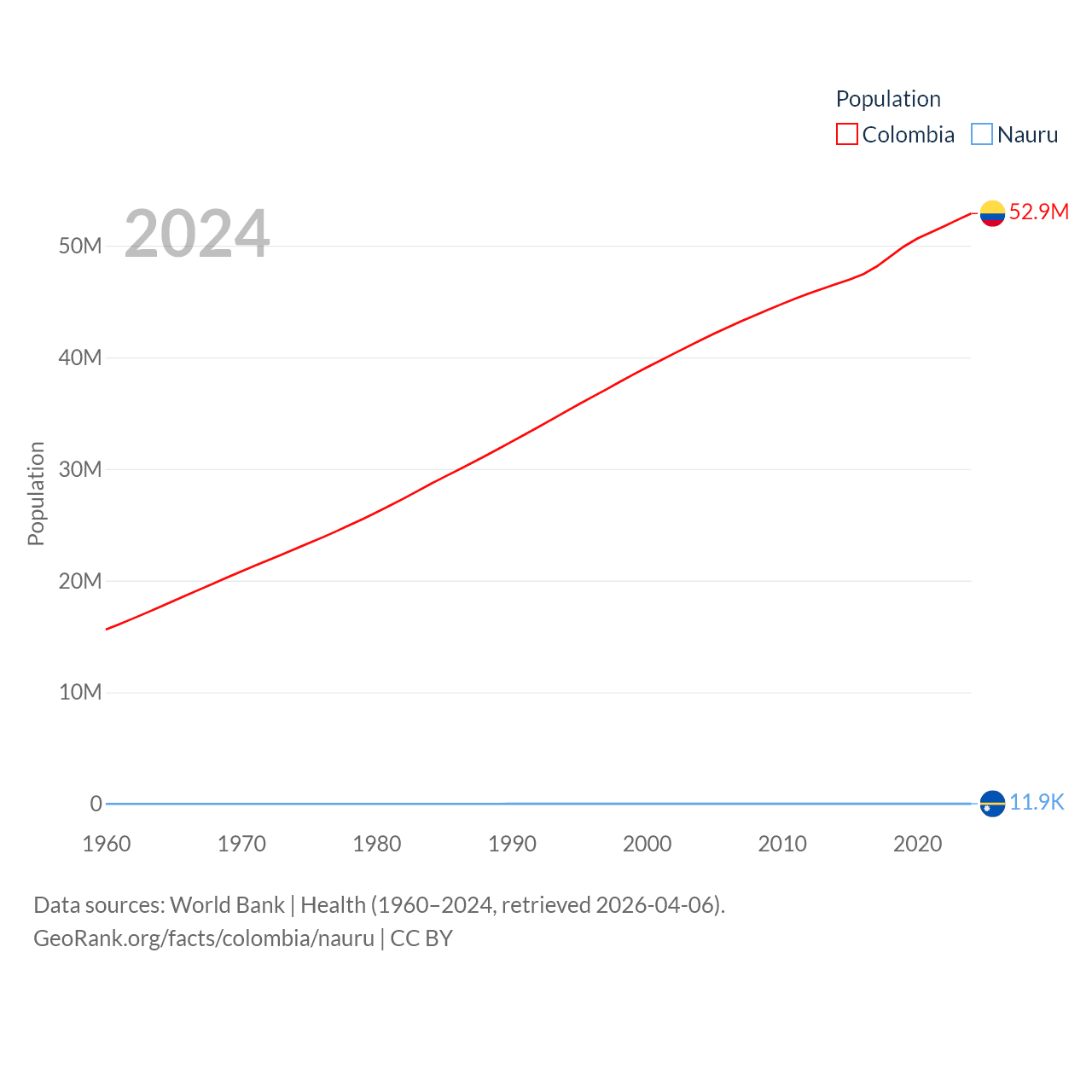 Colombia has a population of 52.9M (ranked 28/197), compared with 11.9K in Nauru (ranked 195/197). Colombia's land area is 428,380 sq mi versus 7.72 sq mi for Nauru (ranked 26th vs. 195th).