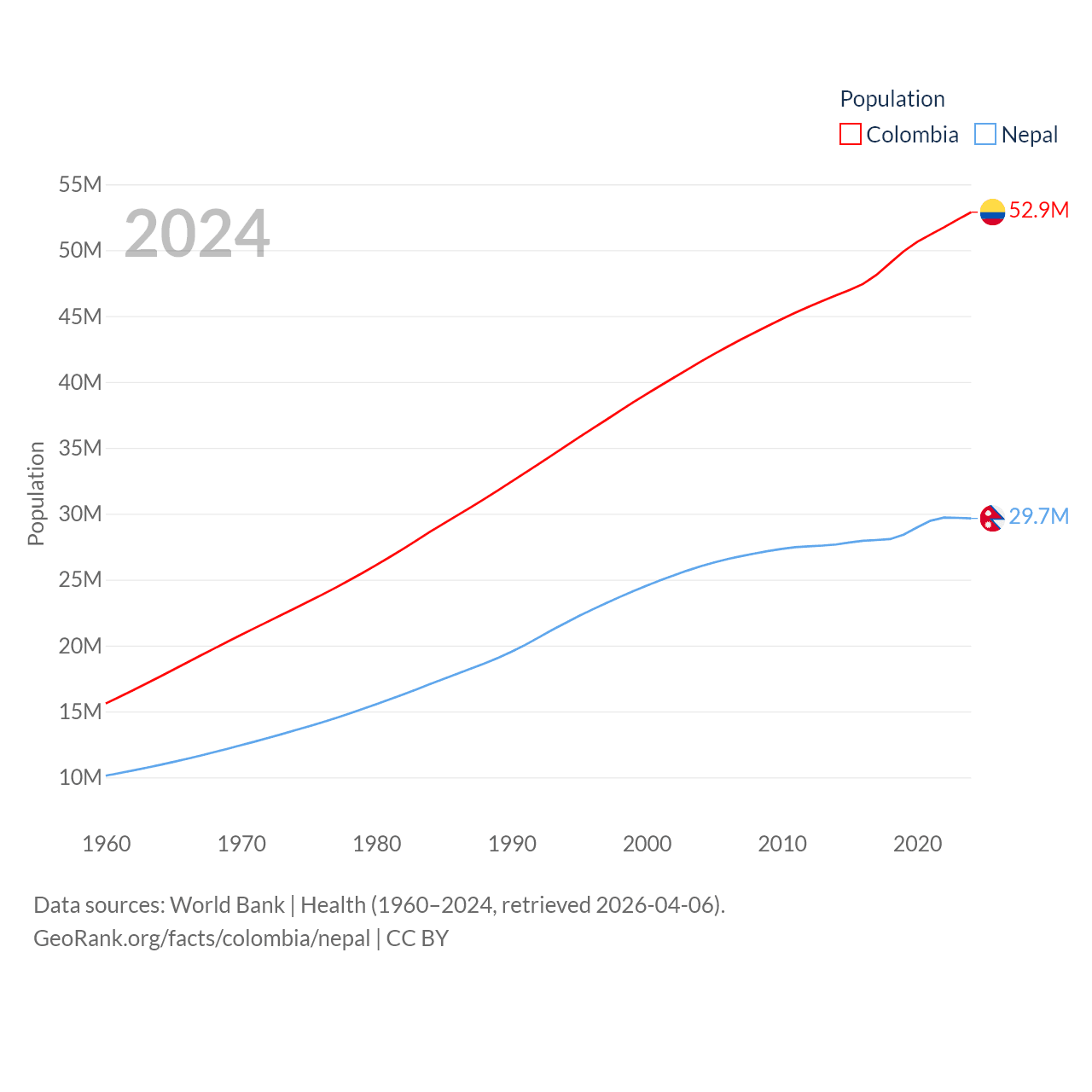 Colombia has a population of 52.9M (ranked 28/197), compared with 29.7M in Nepal (ranked 51/197). Colombia's land area is 428,380 sq mi versus 55,348 sq mi for Nepal (ranked 26th vs. 92nd).