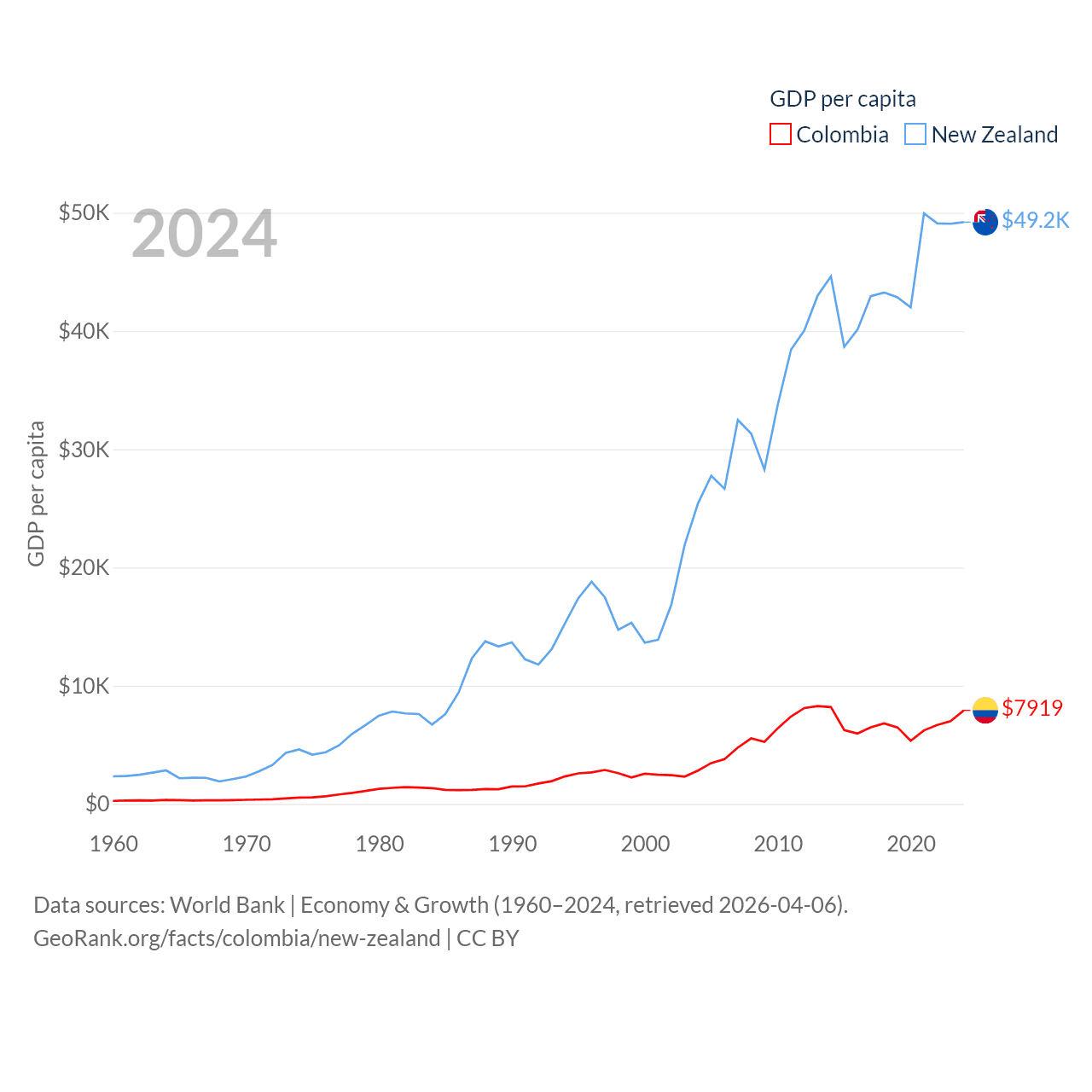 By GDP, Colombia ranks 39/197 ($419B) and New Zealand ranks 52/197 ($260B). By GDP per capita, Colombia ranks 94/197 ($7,919), while New Zealand ranks 26/197 ($49,205).