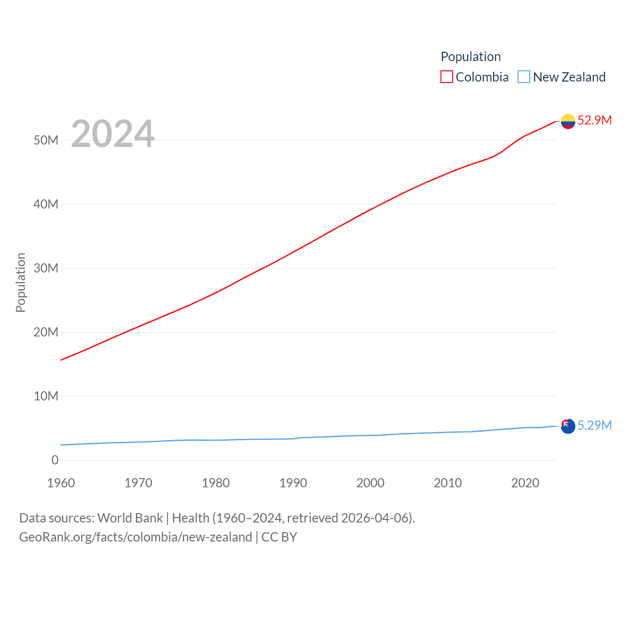 Colombia has a population of 52.9M (ranked 28/197), compared with 5.29M in New Zealand (ranked 123/197). Colombia's land area is 428,380 sq mi versus 101,665 sq mi for New Zealand (ranked 26th vs. 74th).