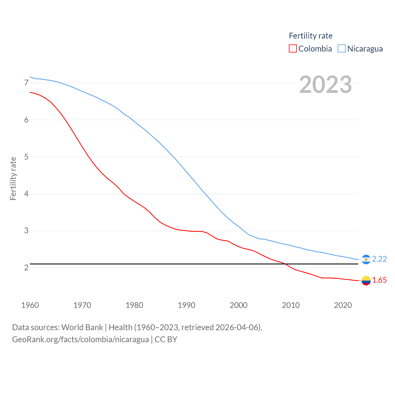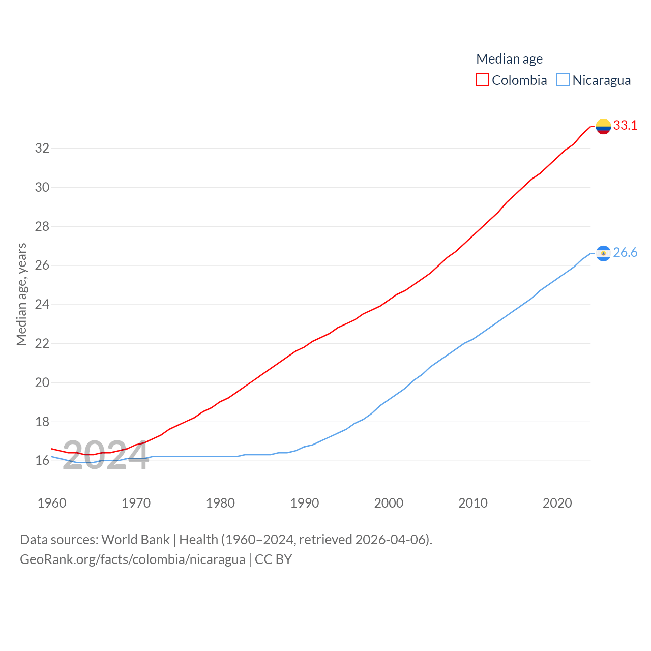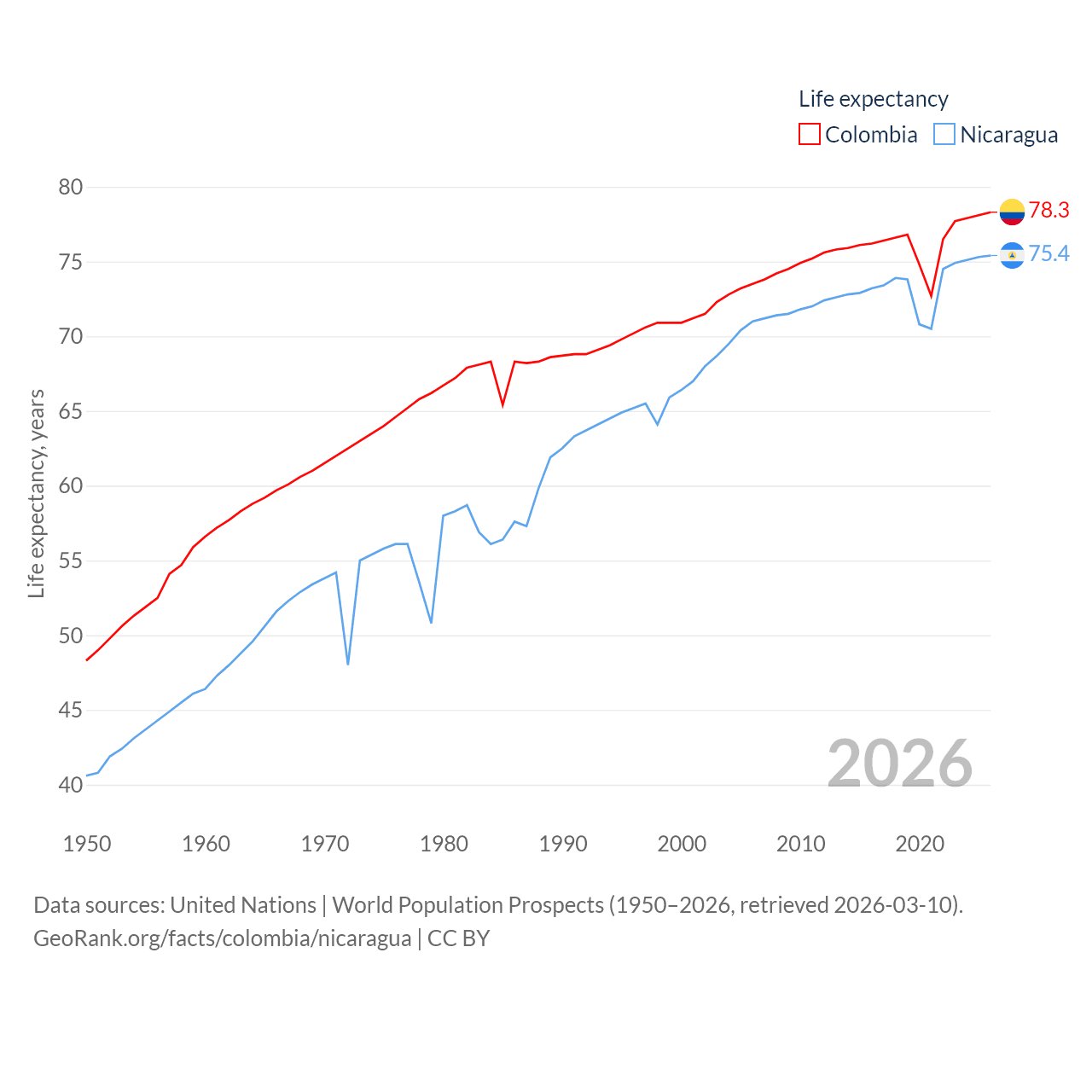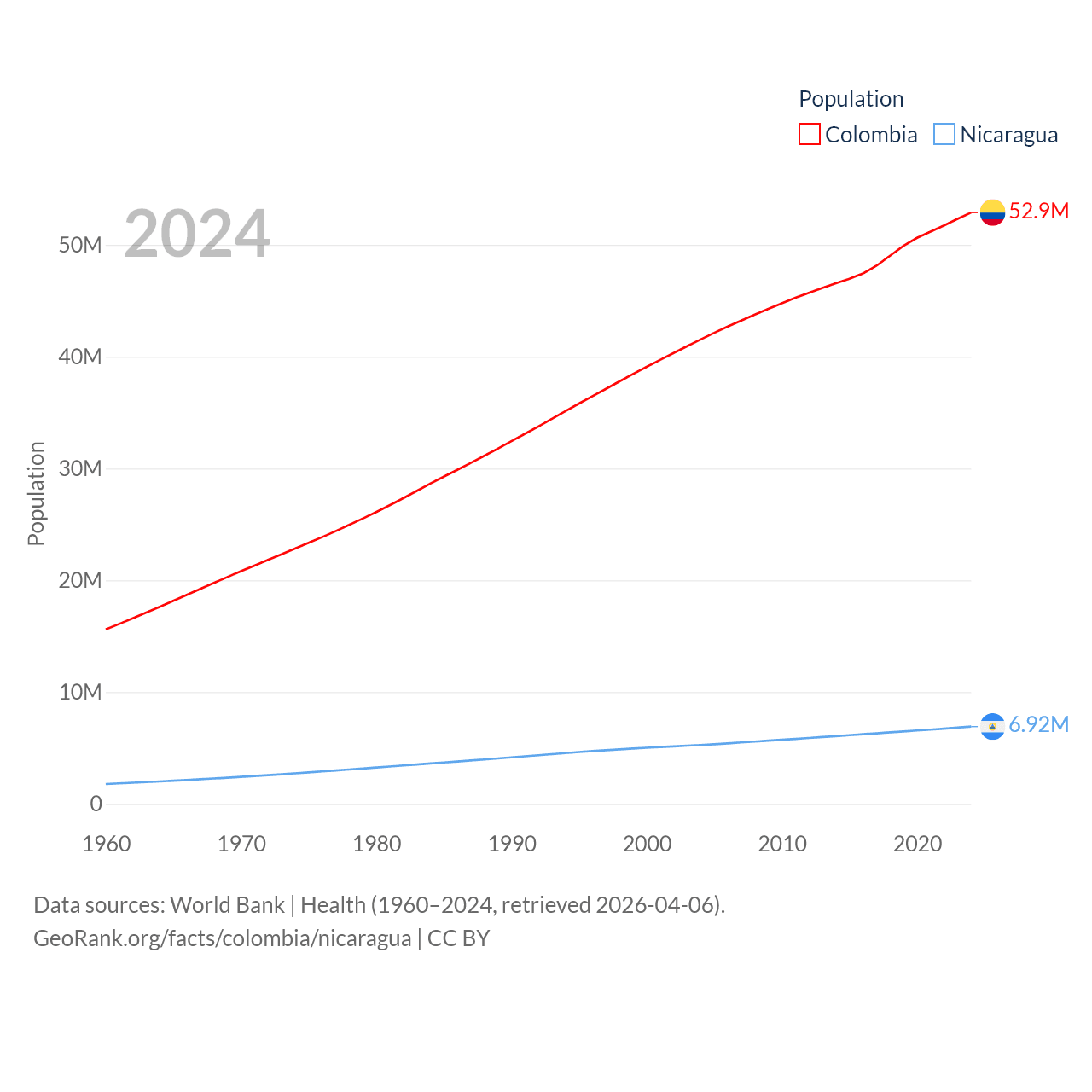 Colombia has a population of 52.9M (ranked 28/197), compared with 6.92M in Nicaragua (ranked 108/197). Colombia's land area is 428,380 sq mi versus 46,464 sq mi for Nicaragua (ranked 26th vs. 98th).