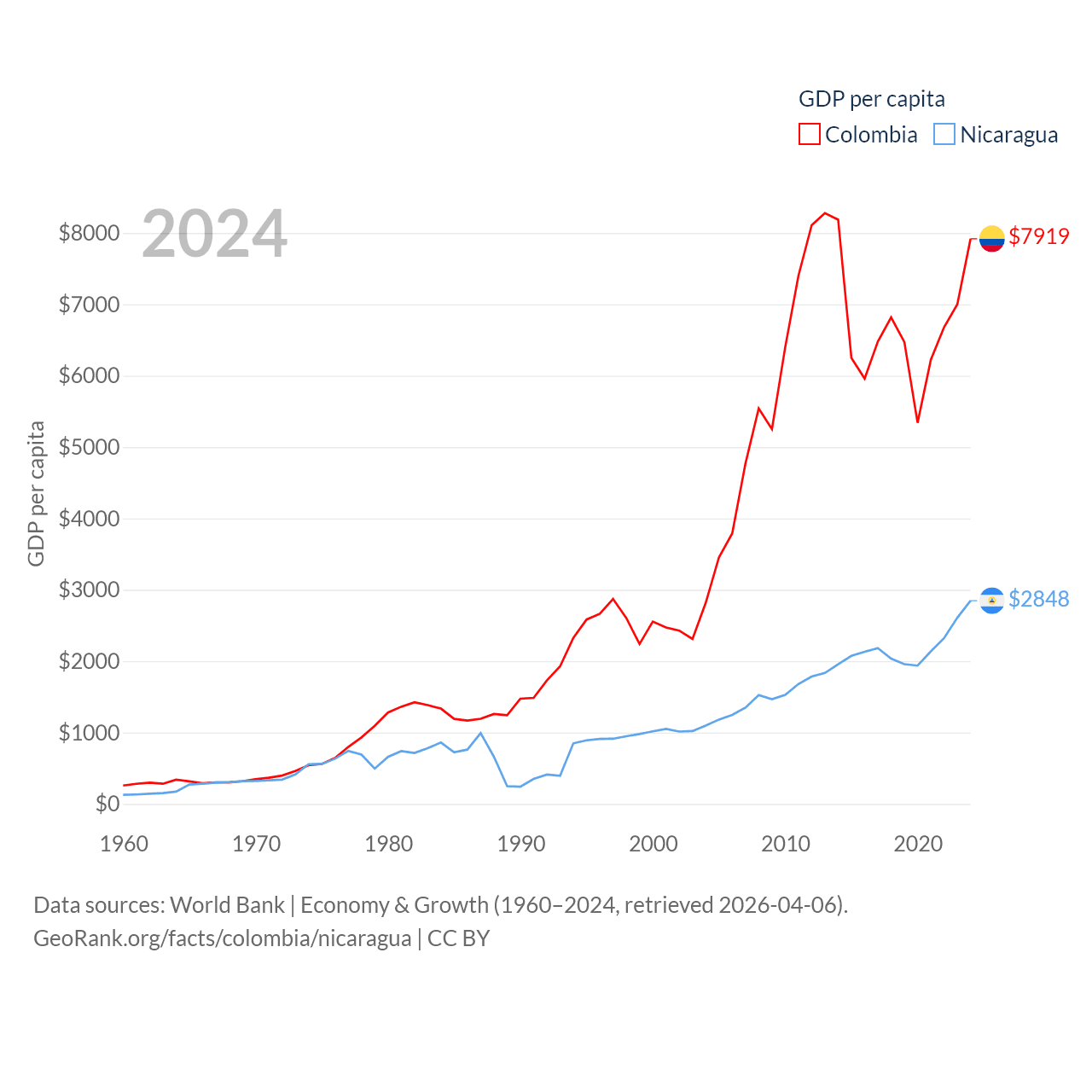 By GDP, Colombia ranks 39/197 ($419B) and Nicaragua ranks 131/197 ($19.7B). By GDP per capita, Colombia ranks 94/197 ($7,919), while Nicaragua ranks 141/197 ($2,848).