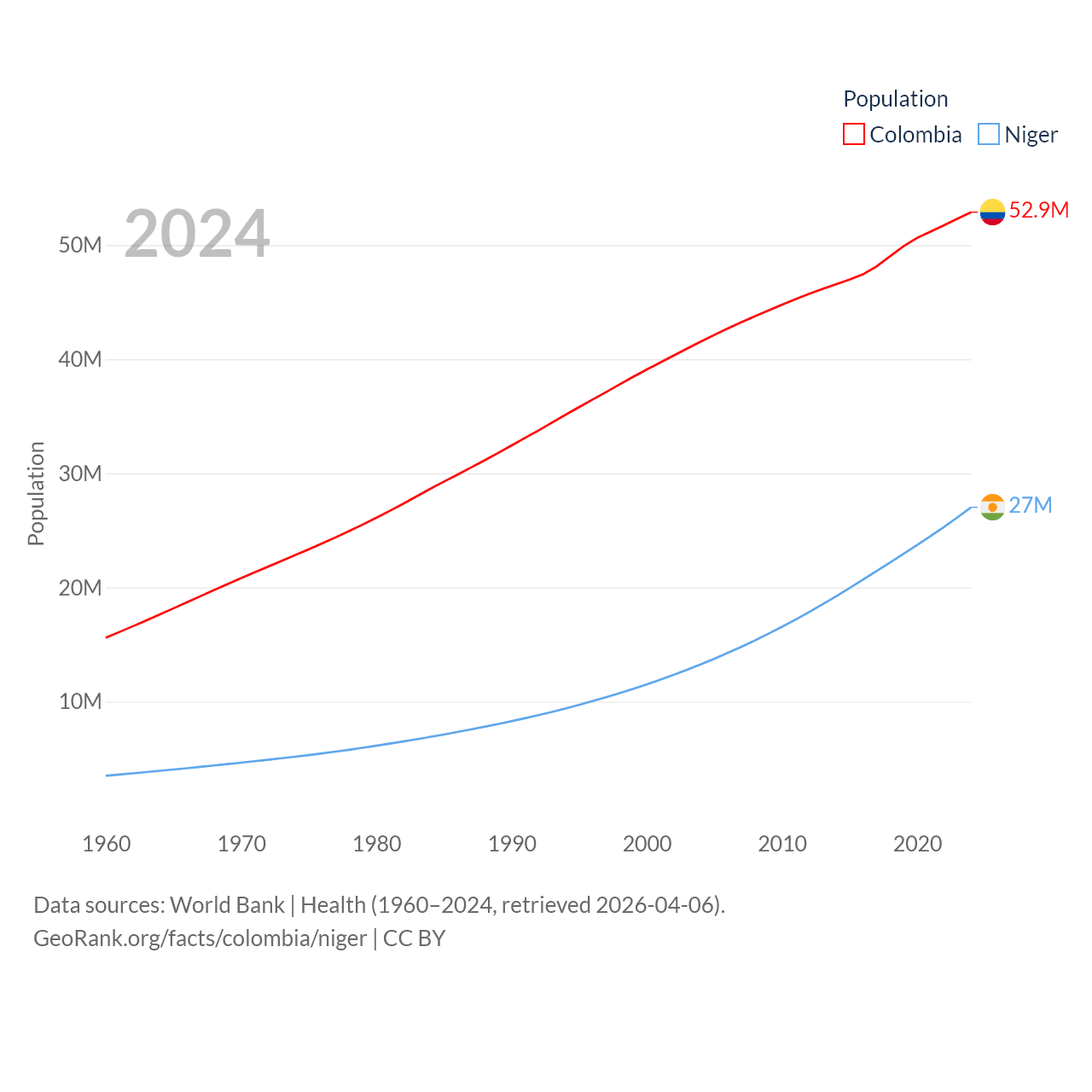 Colombia has a population of 52.9M (ranked 28/197), compared with 27M in Niger (ranked 55/197). Colombia's land area is 428,380 sq mi versus 489,076 sq mi for Niger (ranked 26th vs. 20th).