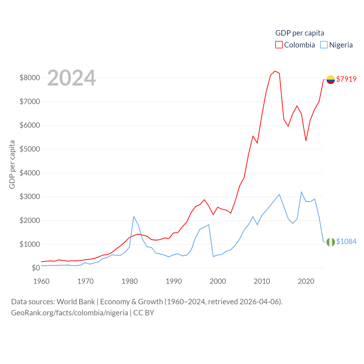 By GDP, Colombia ranks 39/197 ($419B) and Nigeria ranks 54/197 ($252B). By GDP per capita, Colombia ranks 94/197 ($7,919), while Nigeria ranks 174/197 ($1,084).