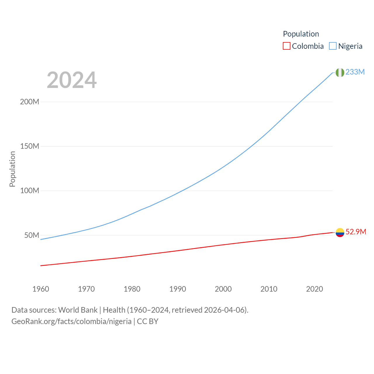 Colombia has a population of 52.9M (ranked 28/197), compared with 233M in Nigeria (ranked 6/197). Colombia's land area is 428,380 sq mi versus 351,650 sq mi for Nigeria (ranked 26th vs. 30th).
