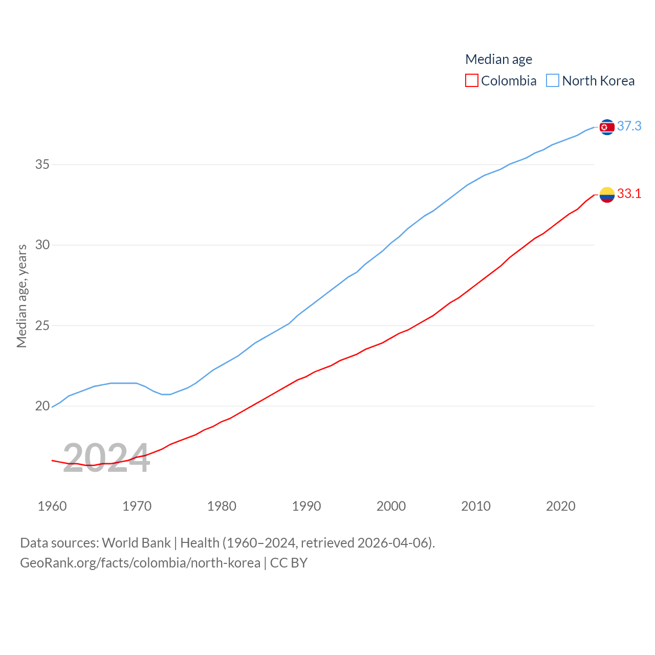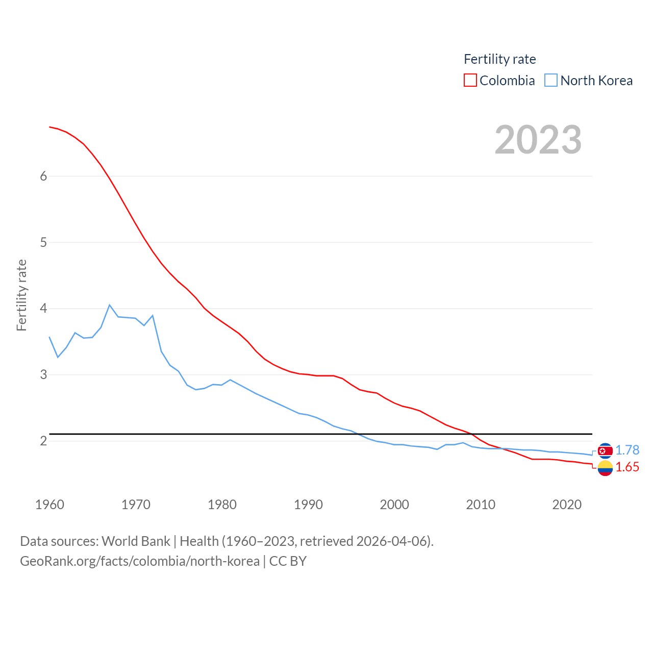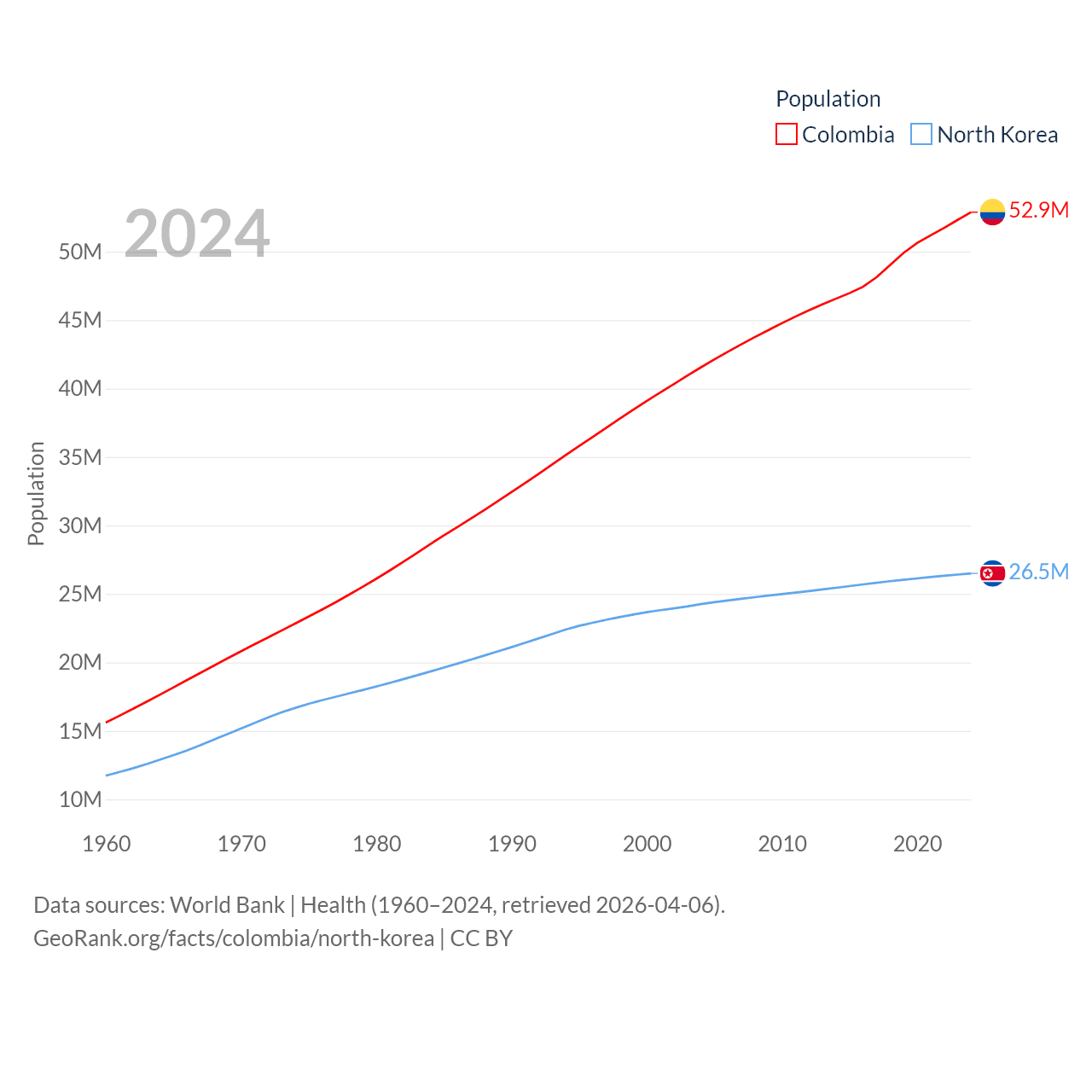 Colombia has a population of 52.9M (ranked 28/197), compared with 26.5M in North Korea (ranked 56/197). Colombia's land area is 428,380 sq mi versus 46,491 sq mi for North Korea (ranked 26th vs. 97th).