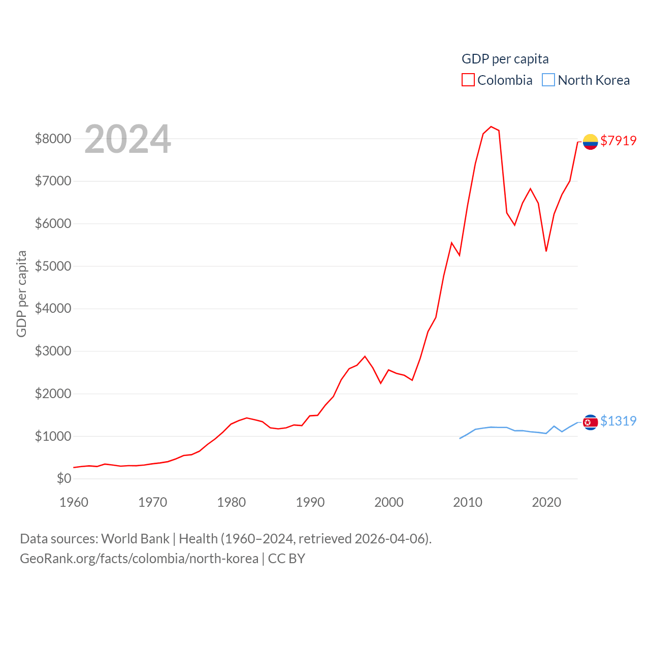 By GDP, Colombia ranks 39/197 ($419B) and North Korea ranks 106/197 ($34.9B). By GDP per capita, Colombia ranks 94/197 ($7,919), while North Korea ranks 168/197 ($1,319).