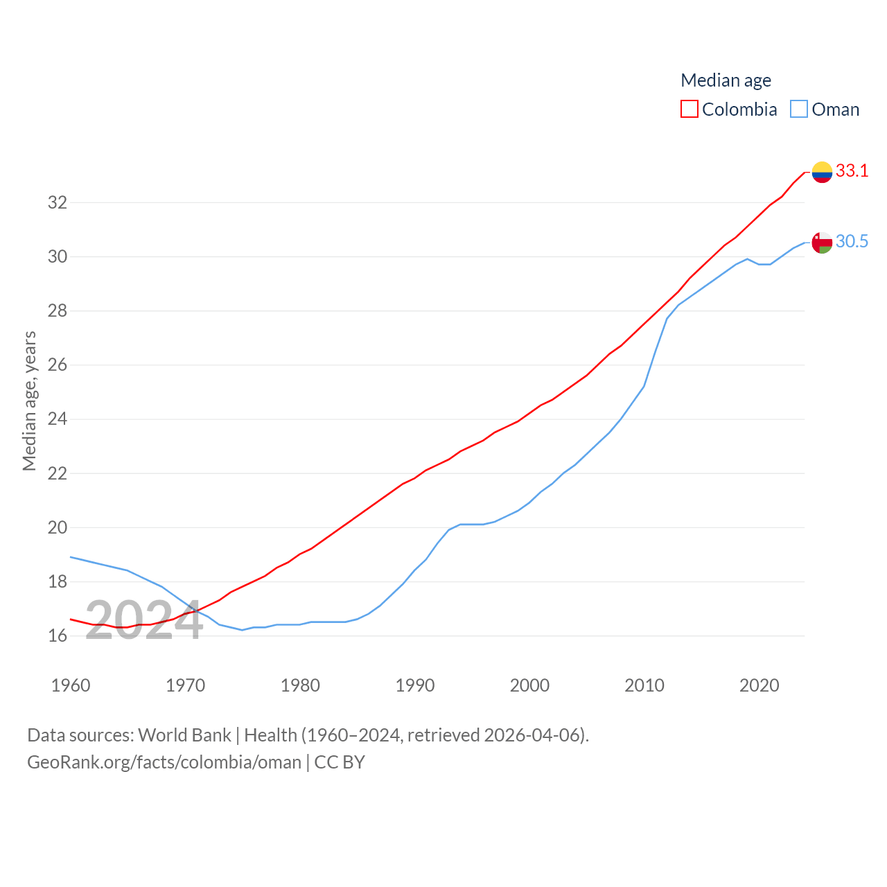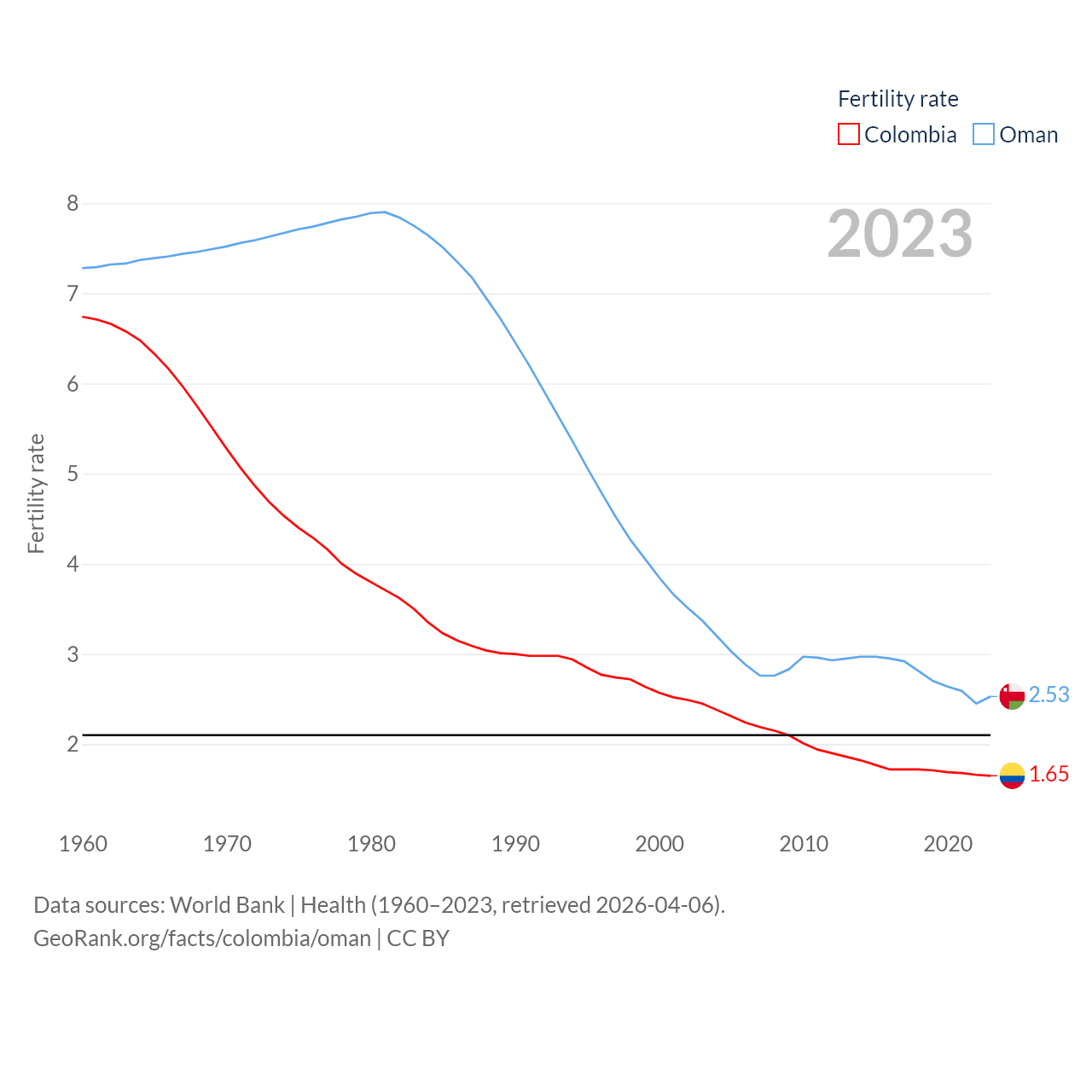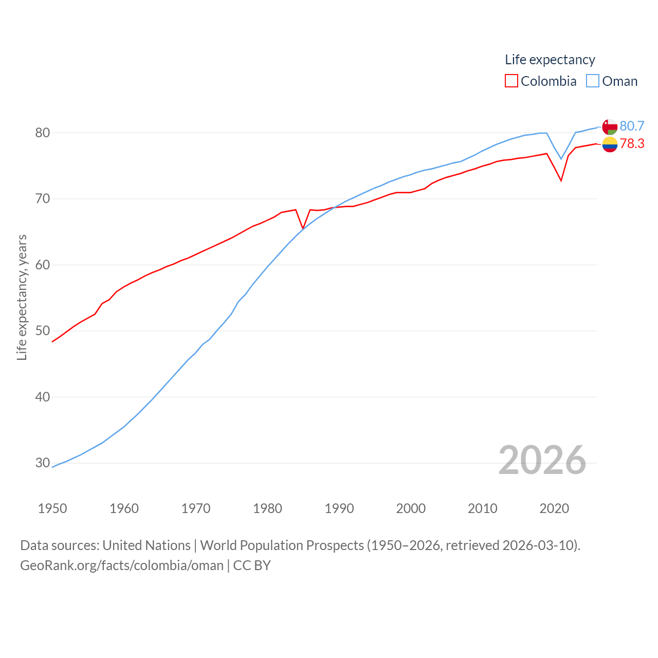 Colombia has a population of 52.9M (ranked 28/197), compared with 5.28M in Oman (ranked 124/197). Colombia's land area is 428,380 sq mi versus 119,499 sq mi for Oman (ranked 26th vs. 68th).