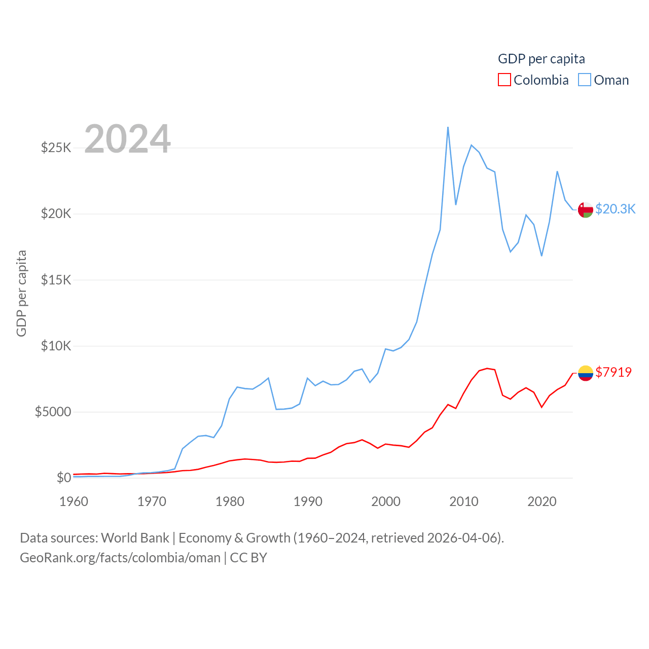 By GDP, Colombia ranks 39/197 ($419B) and Oman ranks 70/197 ($107B). By GDP per capita, Colombia ranks 94/197 ($7,919), while Oman ranks 57/197 ($20,285).
