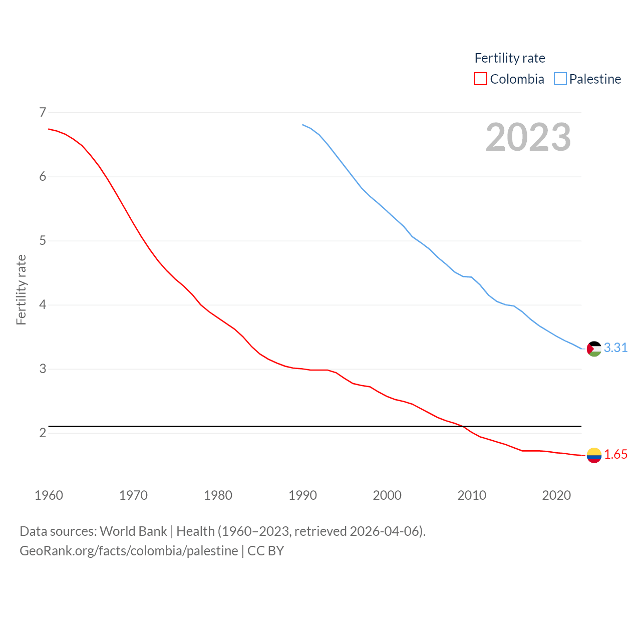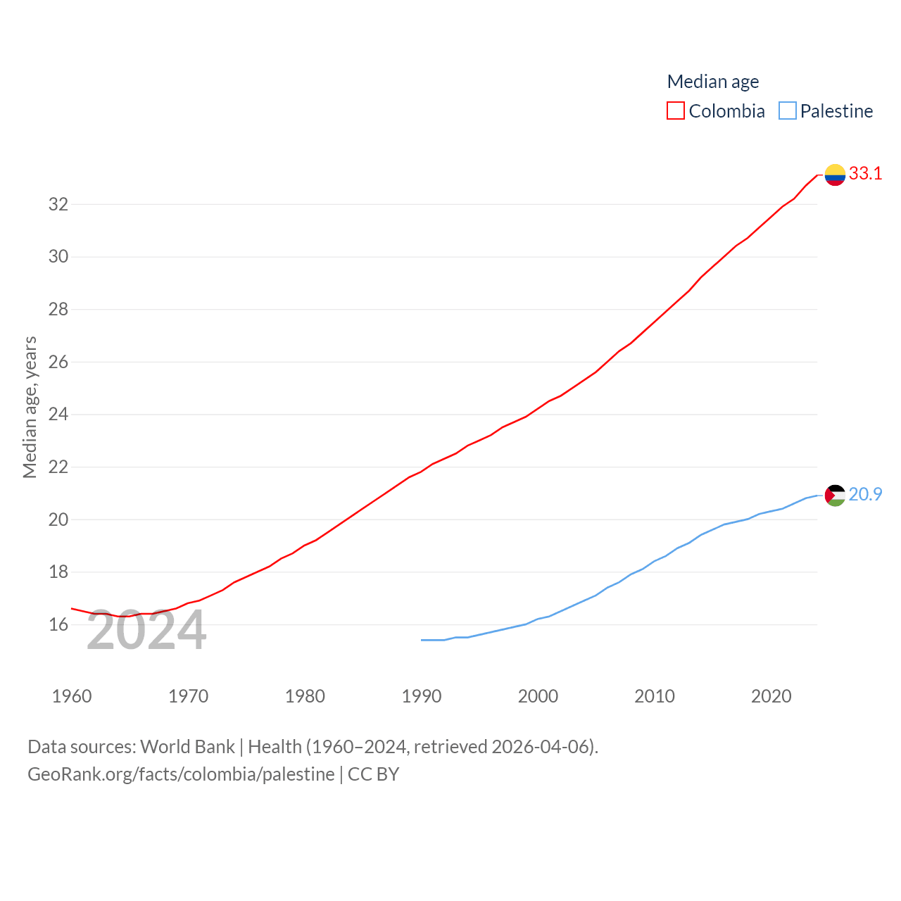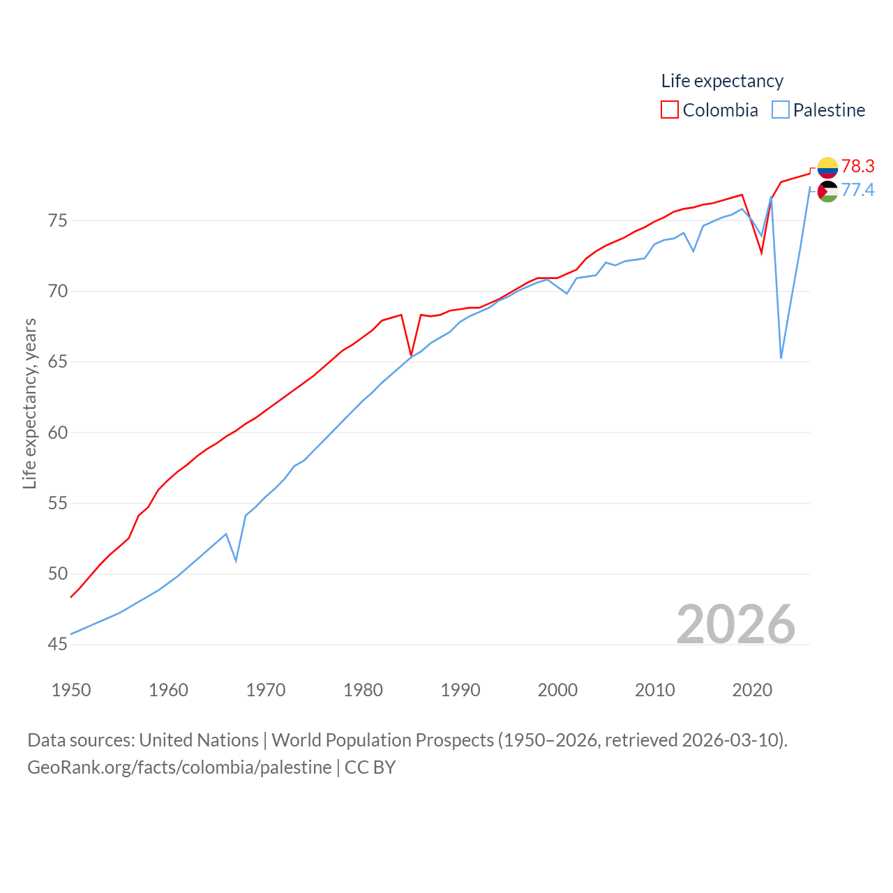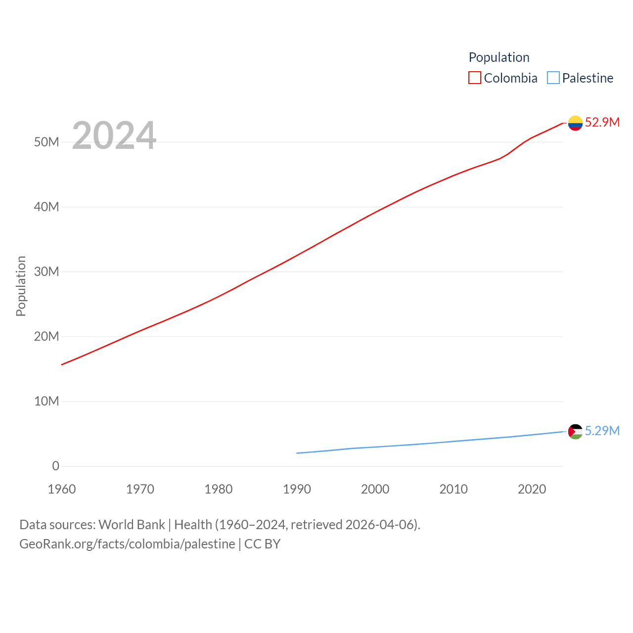 Colombia has a population of 52.9M (ranked 28/197), compared with 5.29M in Palestine (ranked 122/197). Colombia's land area is 428,380 sq mi versus 2,326 sq mi for Palestine (ranked 26th vs. 164th).