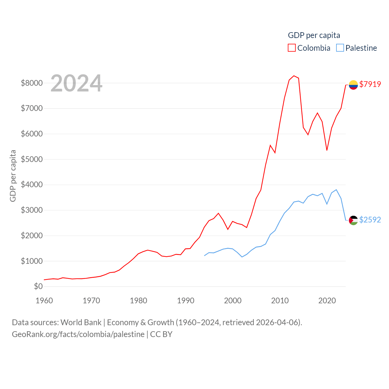 By GDP, Colombia ranks 39/197 ($419B) and Palestine ranks 146/197 ($13.7B). By GDP per capita, Colombia ranks 94/197 ($7,919), while Palestine ranks 147/197 ($2,592).