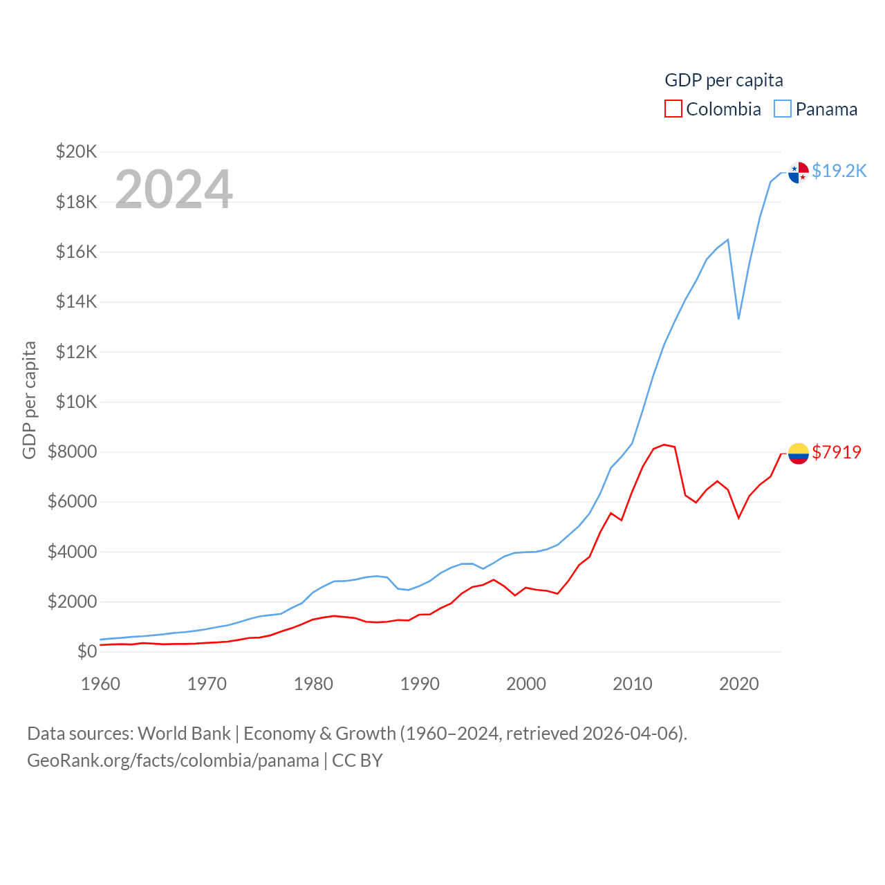 By GDP, Colombia ranks 39/197 ($419B) and Panama ranks 78/197 ($86.5B). By GDP per capita, Colombia ranks 94/197 ($7,919), while Panama ranks 60/197 ($19,161).