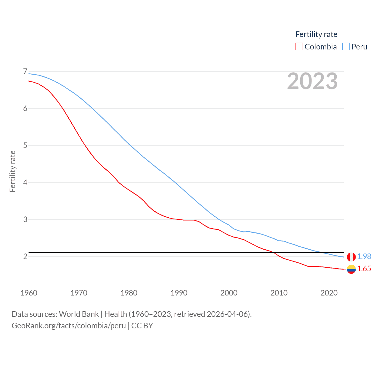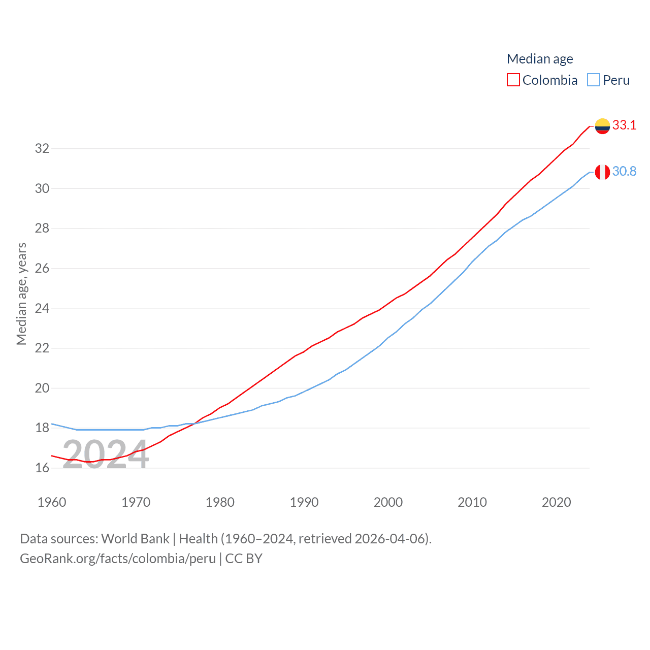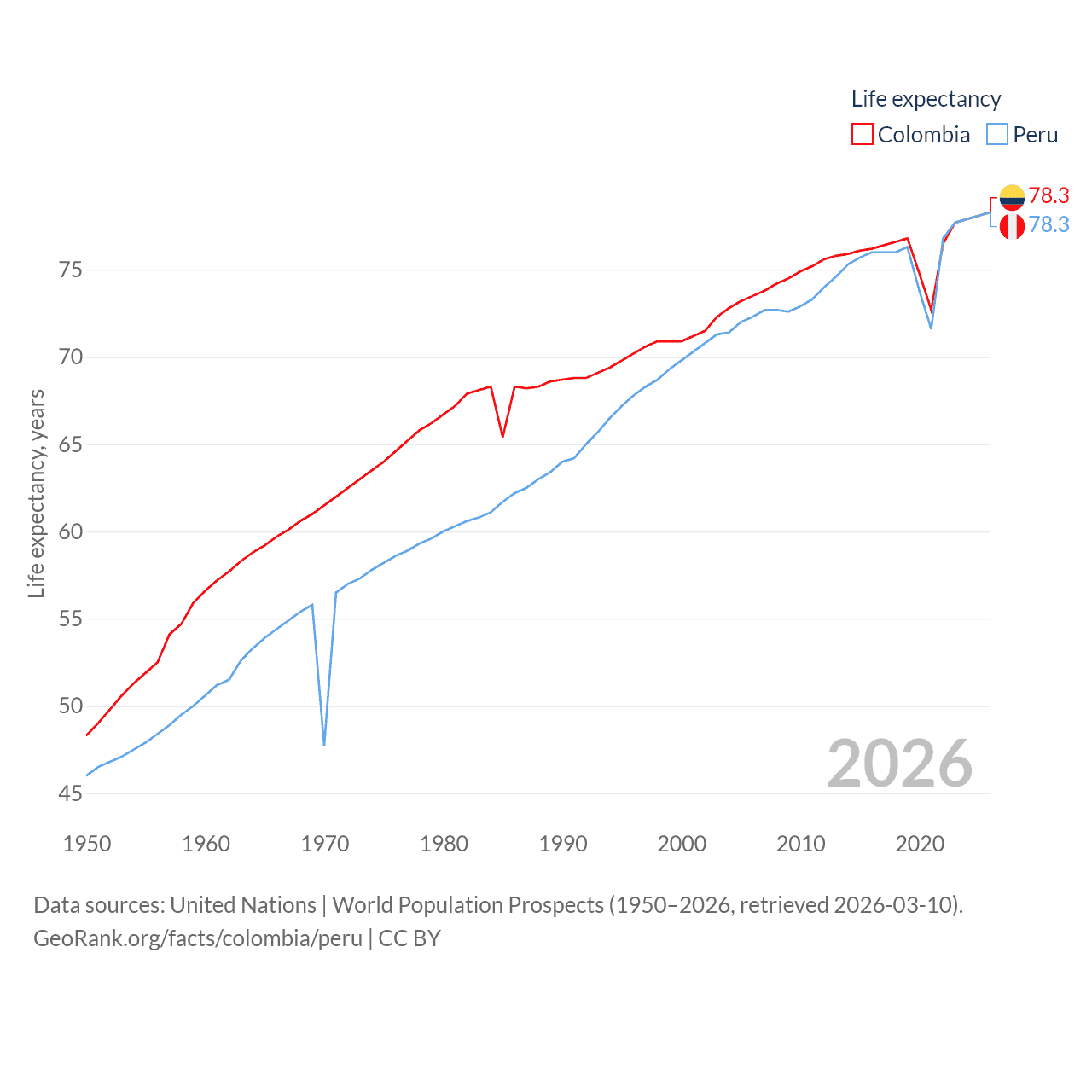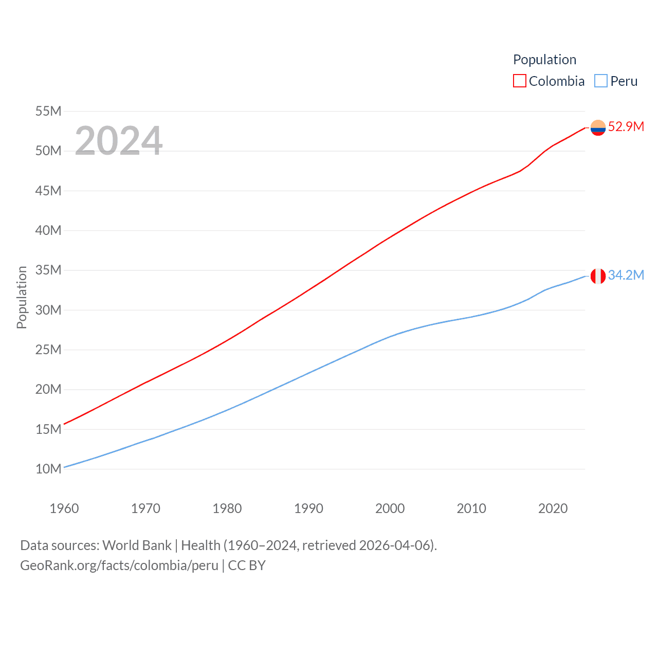 Colombia has a population of 52.9M (ranked 28/197), compared with 34.2M in Peru (ranked 48/197). Colombia's land area is 428,380 sq mi versus 494,211 sq mi for Peru (ranked 26th vs. 19th).