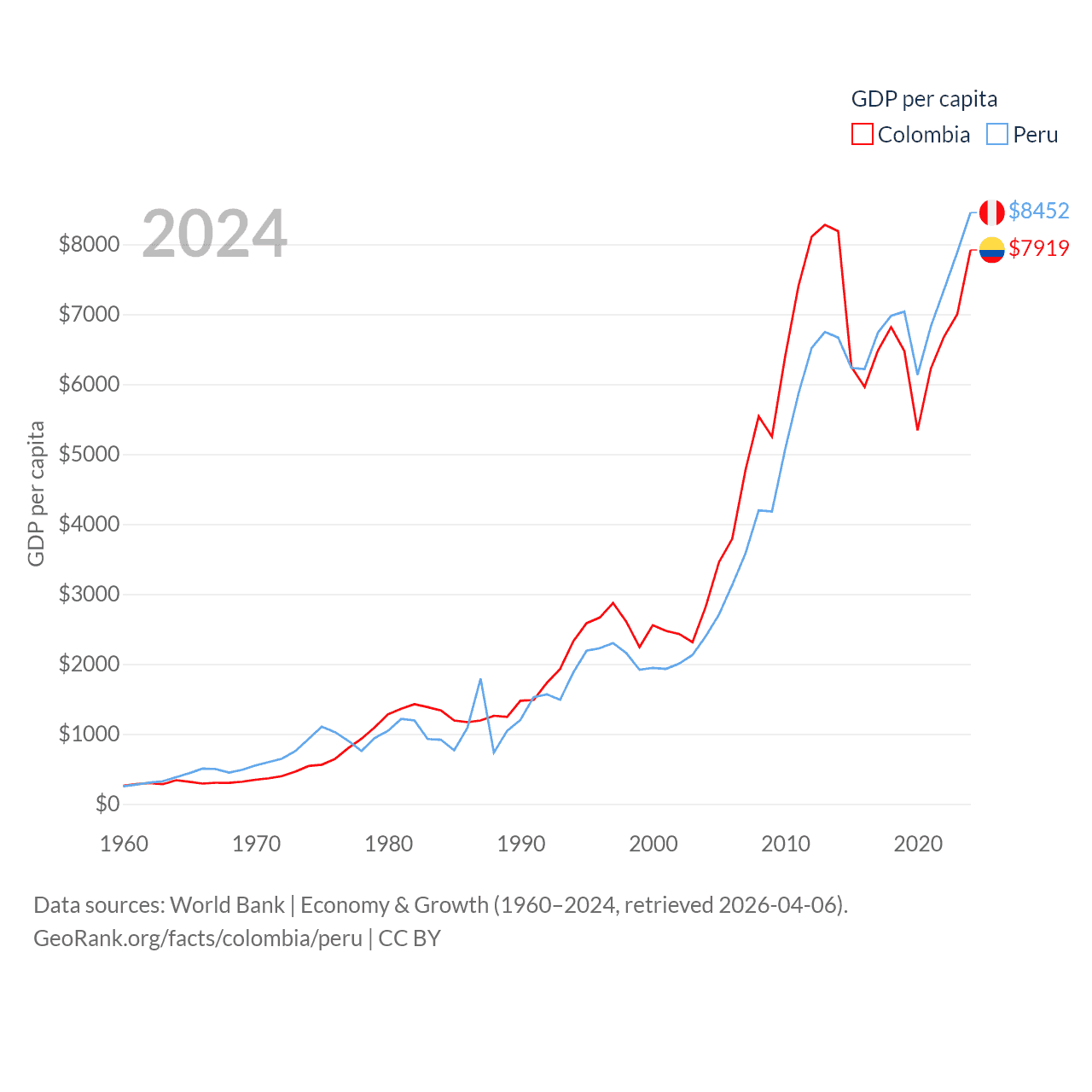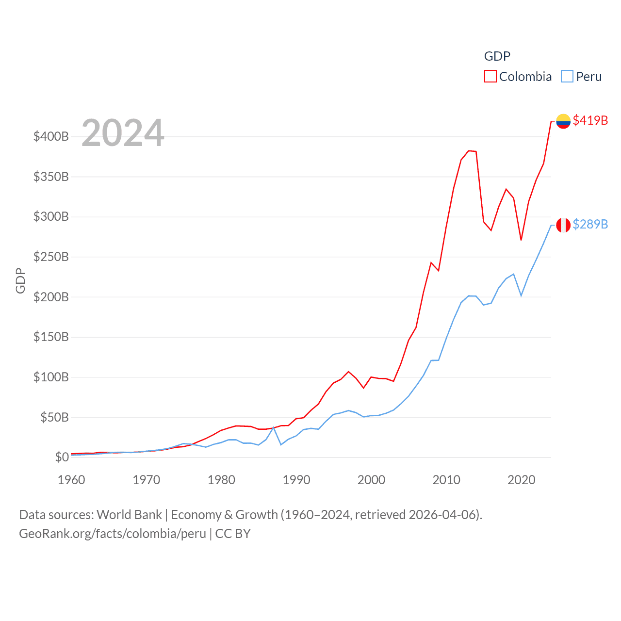 By GDP, Colombia ranks 39/197 ($419B) and Peru ranks 49/197 ($289B). By GDP per capita, Colombia ranks 94/197 ($7,919), while Peru ranks 91/197 ($8,452).