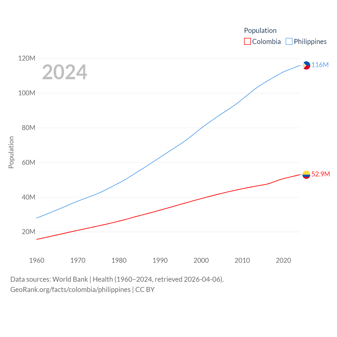 Colombia has a population of 52.9M (ranked 28/197), compared with 116M in The Philippines (ranked 14/197). Colombia's land area is 428,380 sq mi versus 115,124 sq mi for The Philippines (ranked 26th vs. 71st).