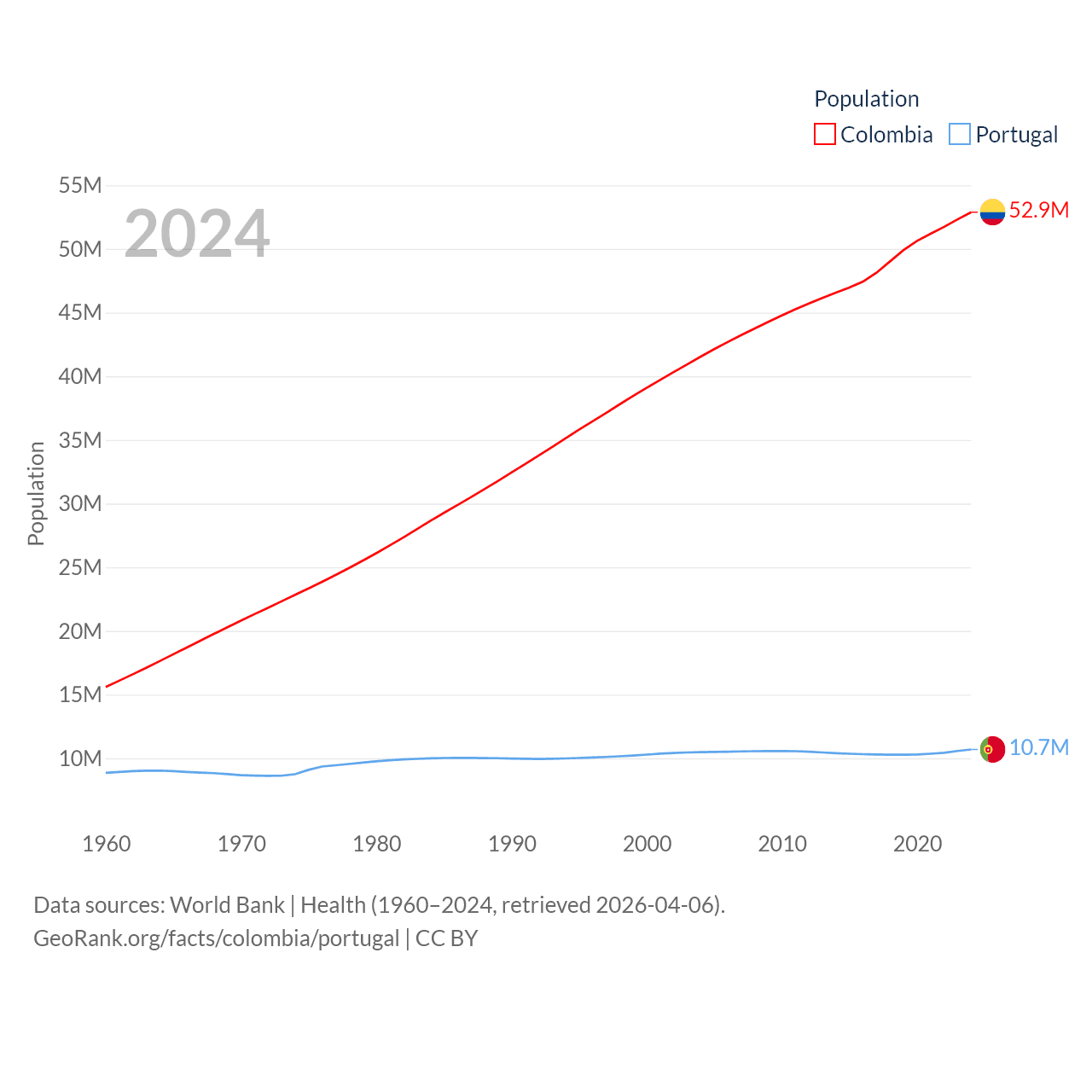 Colombia has a population of 52.9M (ranked 28/197), compared with 10.7M in Portugal (ranked 90/197). Colombia's land area is 428,380 sq mi versus 35,369 sq mi for Portugal (ranked 26th vs. 108th).