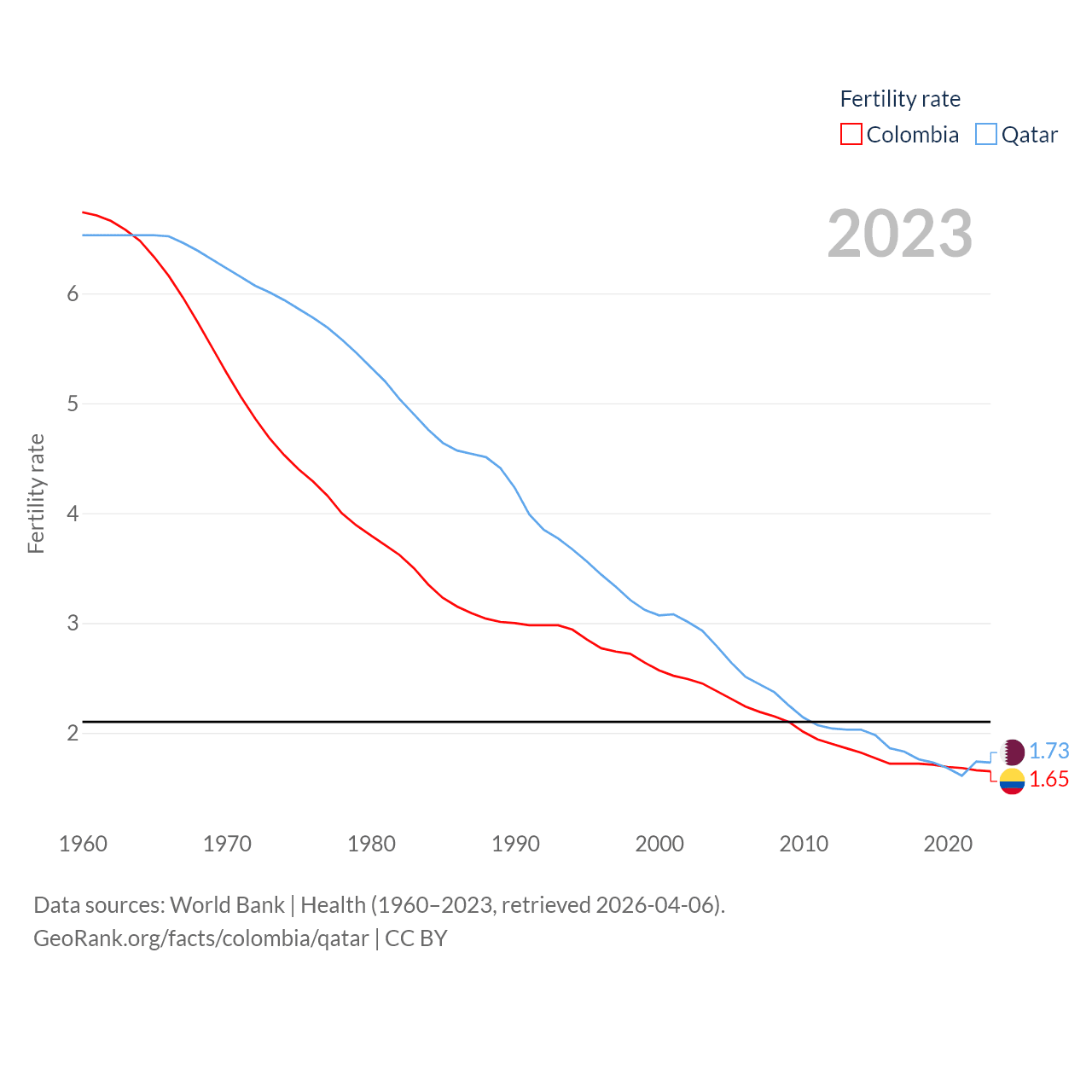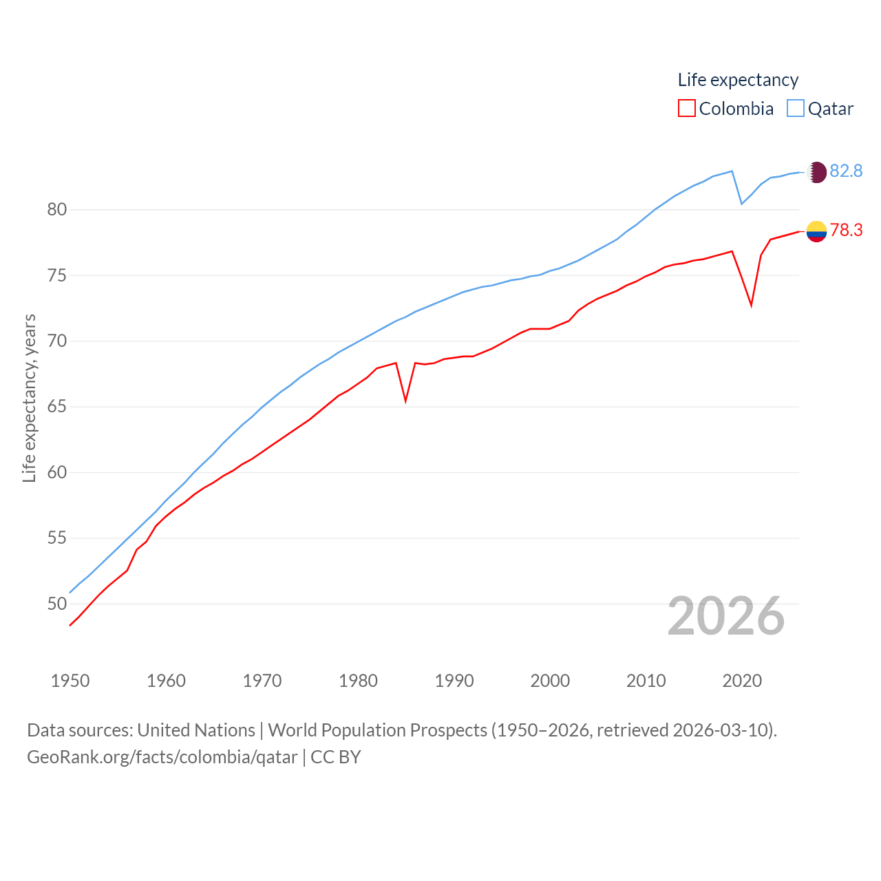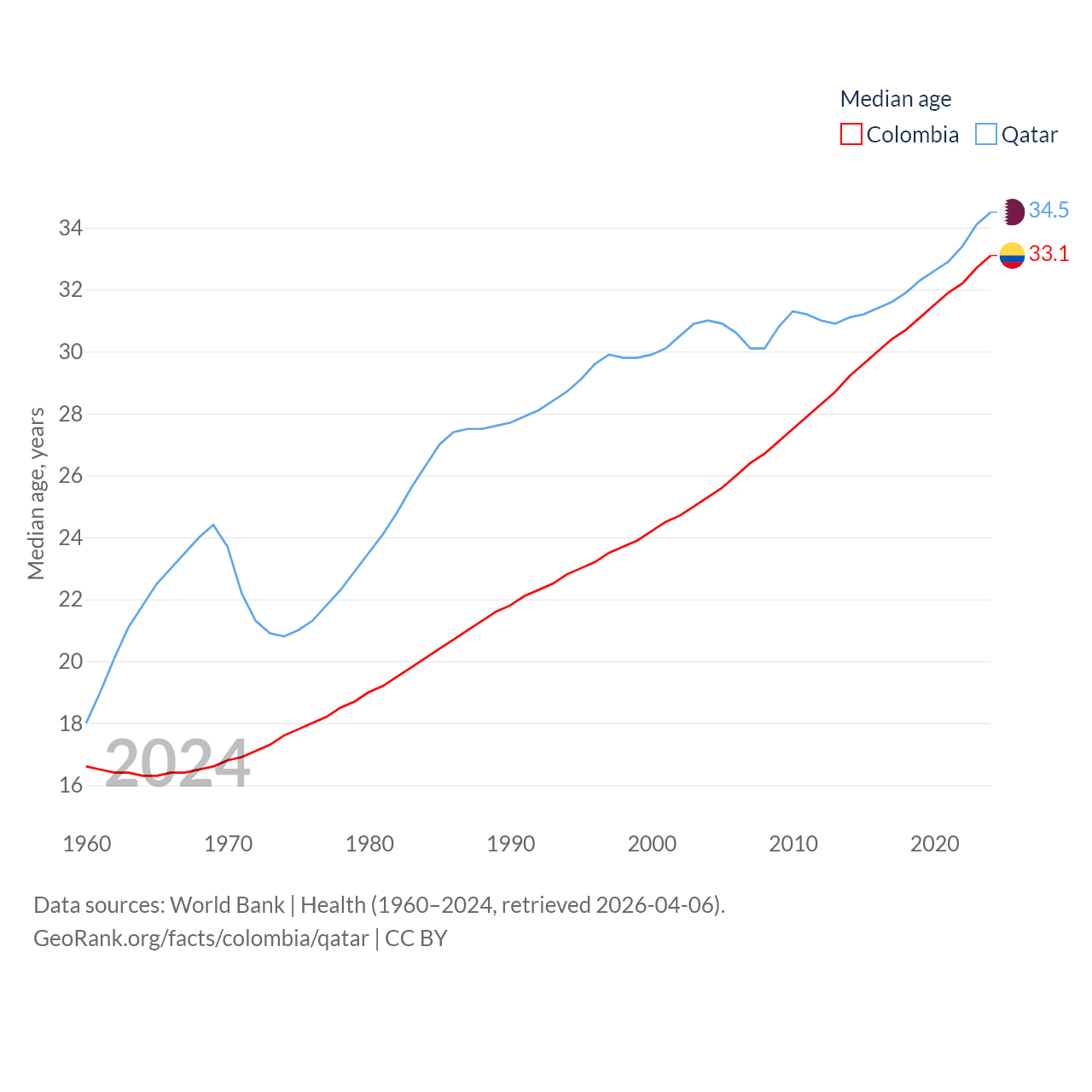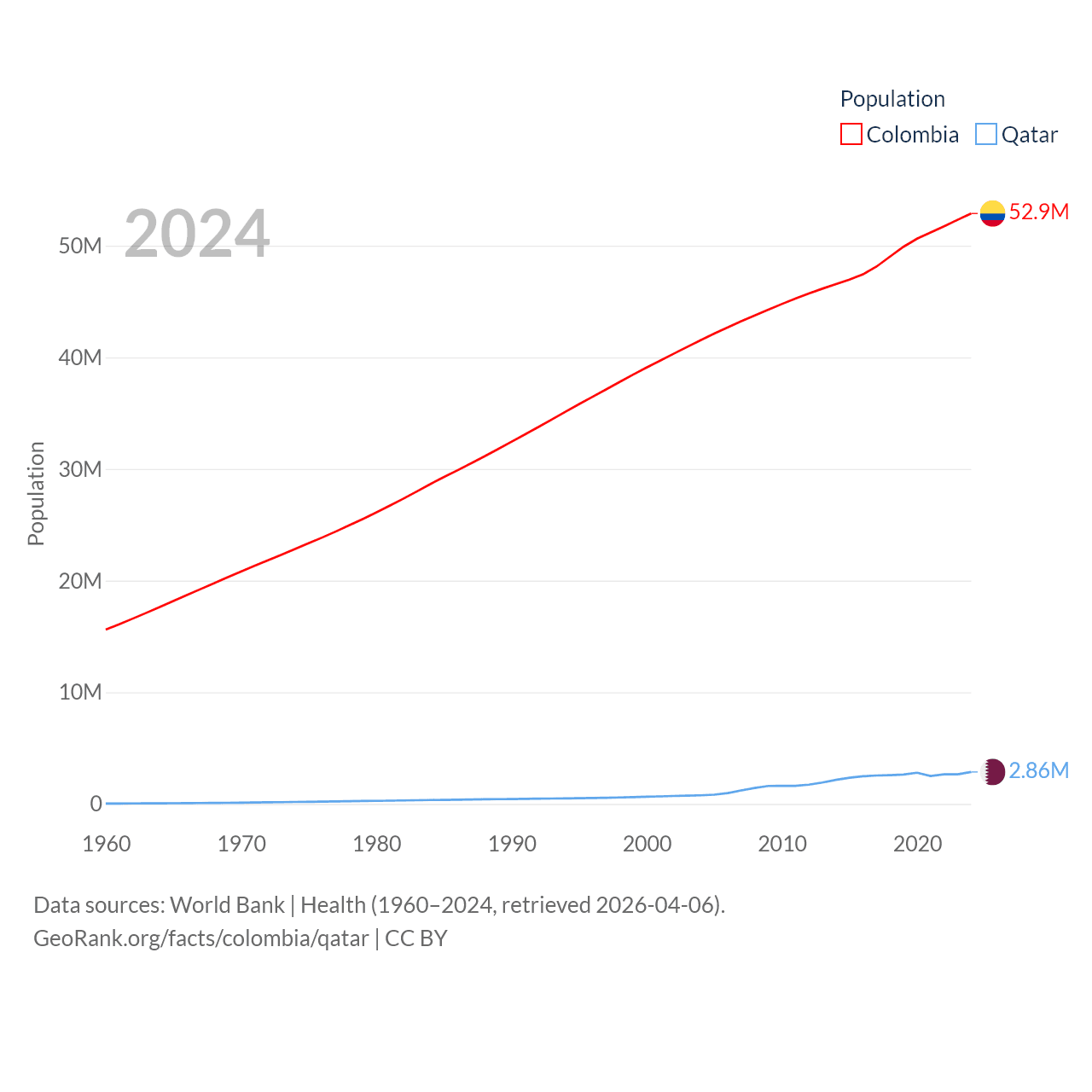 Colombia has a population of 52.9M (ranked 28/197), compared with 2.86M in Qatar (ranked 138/197). Colombia's land area is 428,380 sq mi versus 4,436 sq mi for Qatar (ranked 26th vs. 158th).