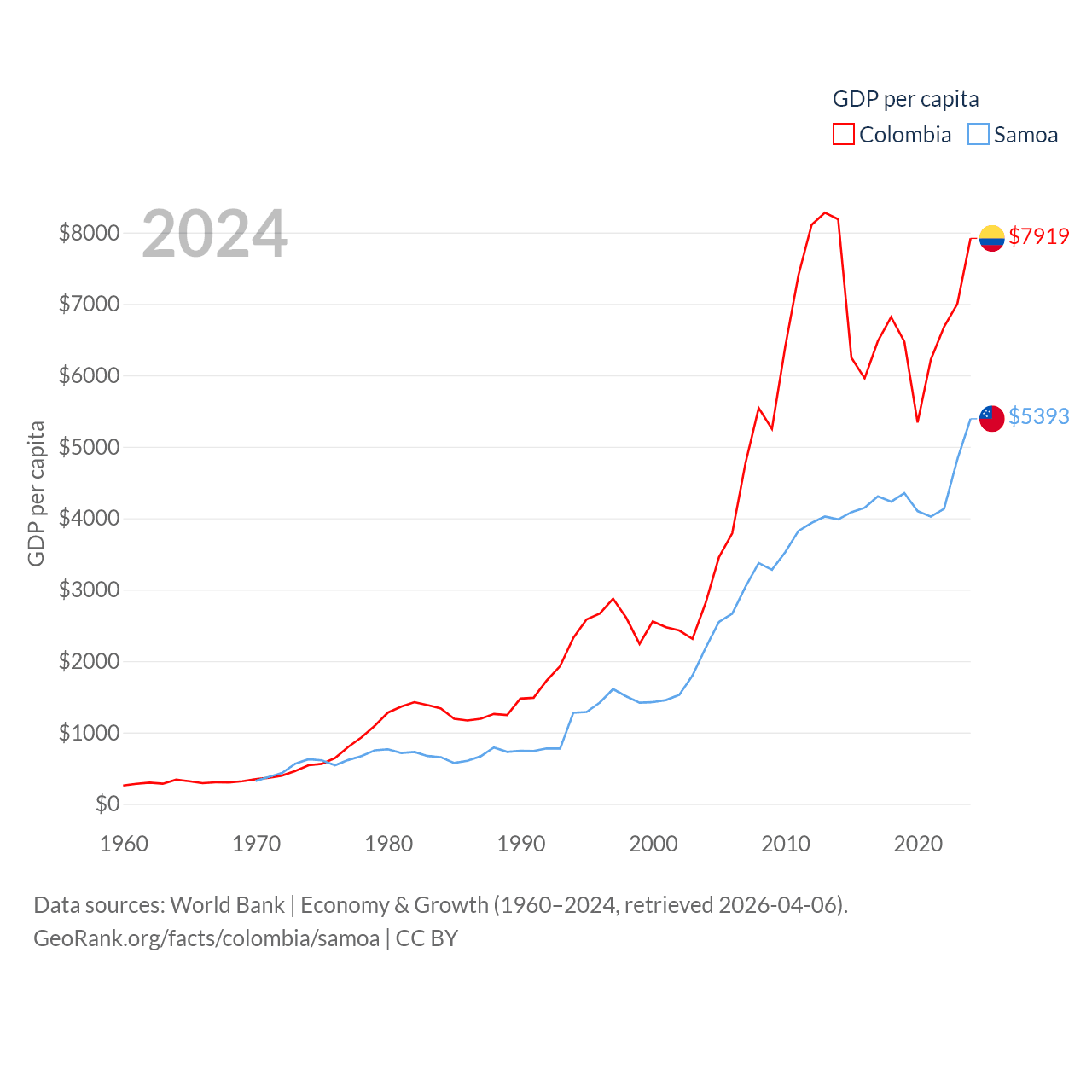 By GDP, Colombia ranks 39/197 ($419B) and Samoa ranks 185/197 ($1.18B). By GDP per capita, Colombia ranks 94/197 ($7,919), while Samoa ranks 117/197 ($5,393).