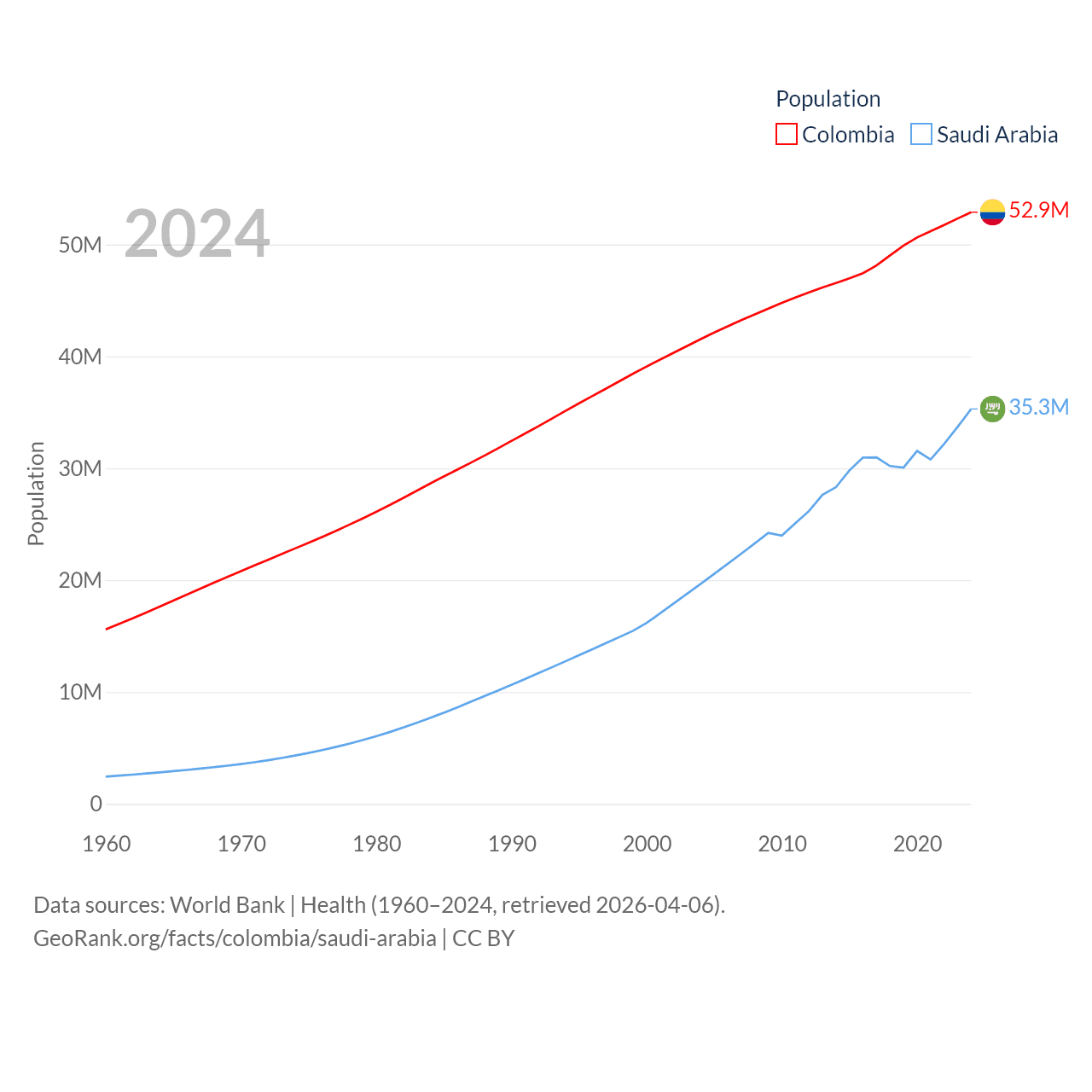 Colombia has a population of 52.9M (ranked 28/197), compared with 35.3M in Saudi Arabia (ranked 45/197). Colombia's land area is 428,380 sq mi versus 830,000 sq mi for Saudi Arabia (ranked 26th vs. 12th).