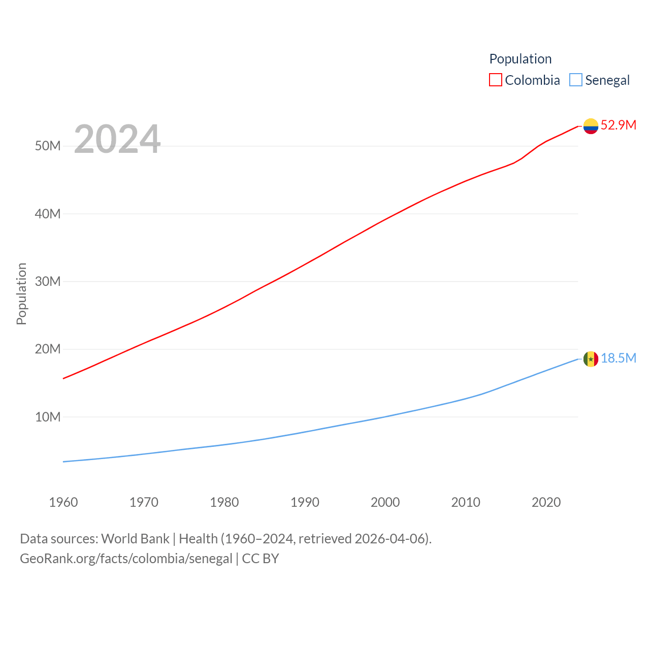 Colombia has a population of 52.9M (ranked 28/197), compared with 18.5M in Senegal (ranked 69/197). Colombia's land area is 428,380 sq mi versus 74,336 sq mi for Senegal (ranked 26th vs. 85th).