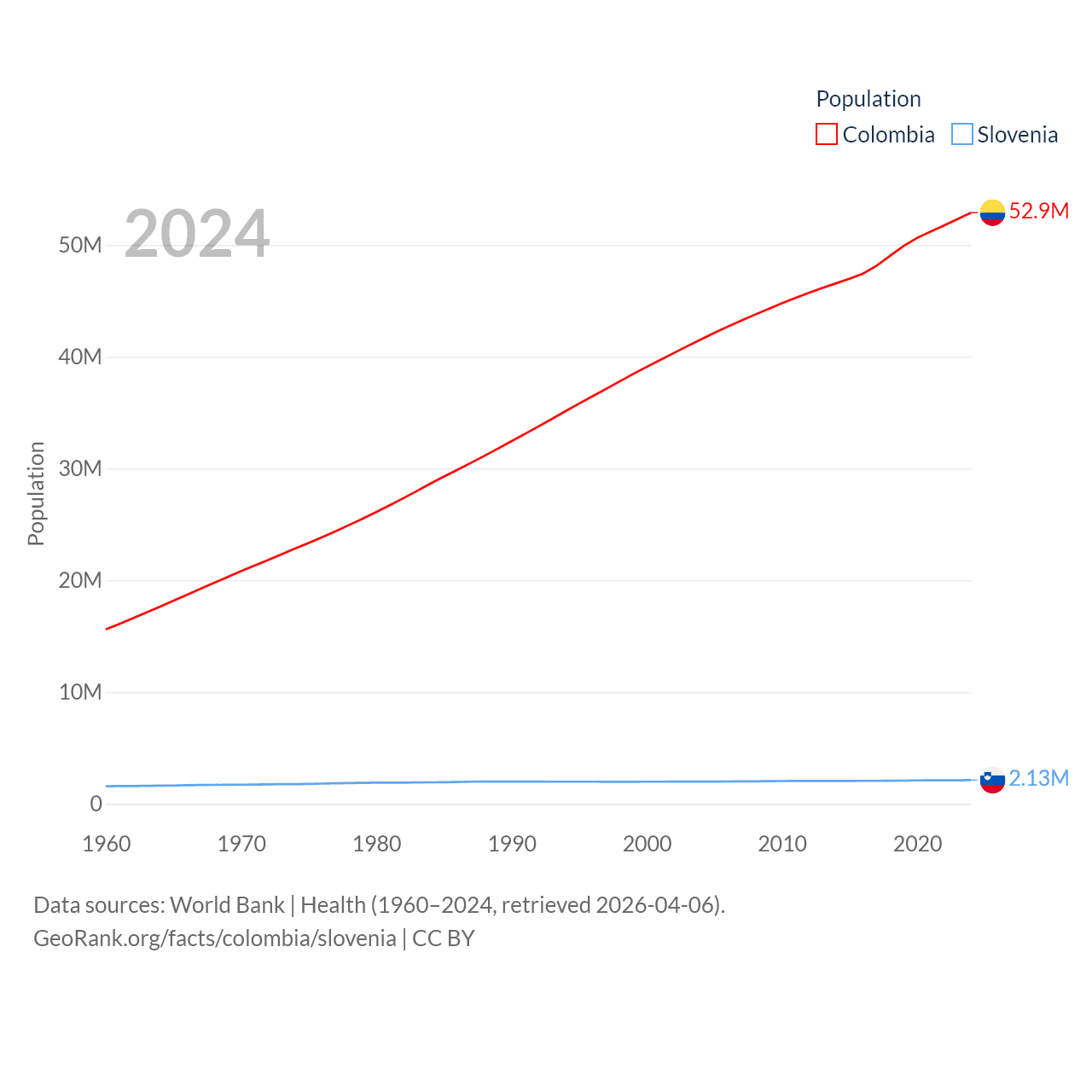 Colombia has a population of 52.9M (ranked 28/197), compared with 2.13M in Slovenia (ranked 147/197). Colombia's land area is 428,380 sq mi versus 7,774 sq mi for Slovenia (ranked 26th vs. 151st).