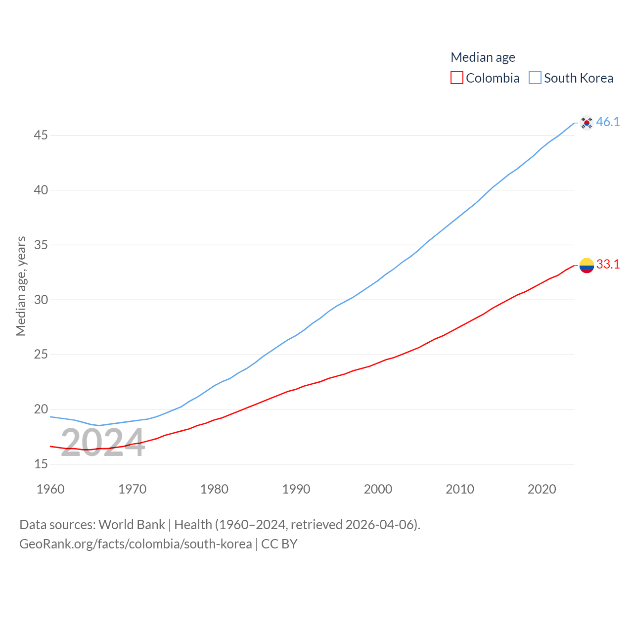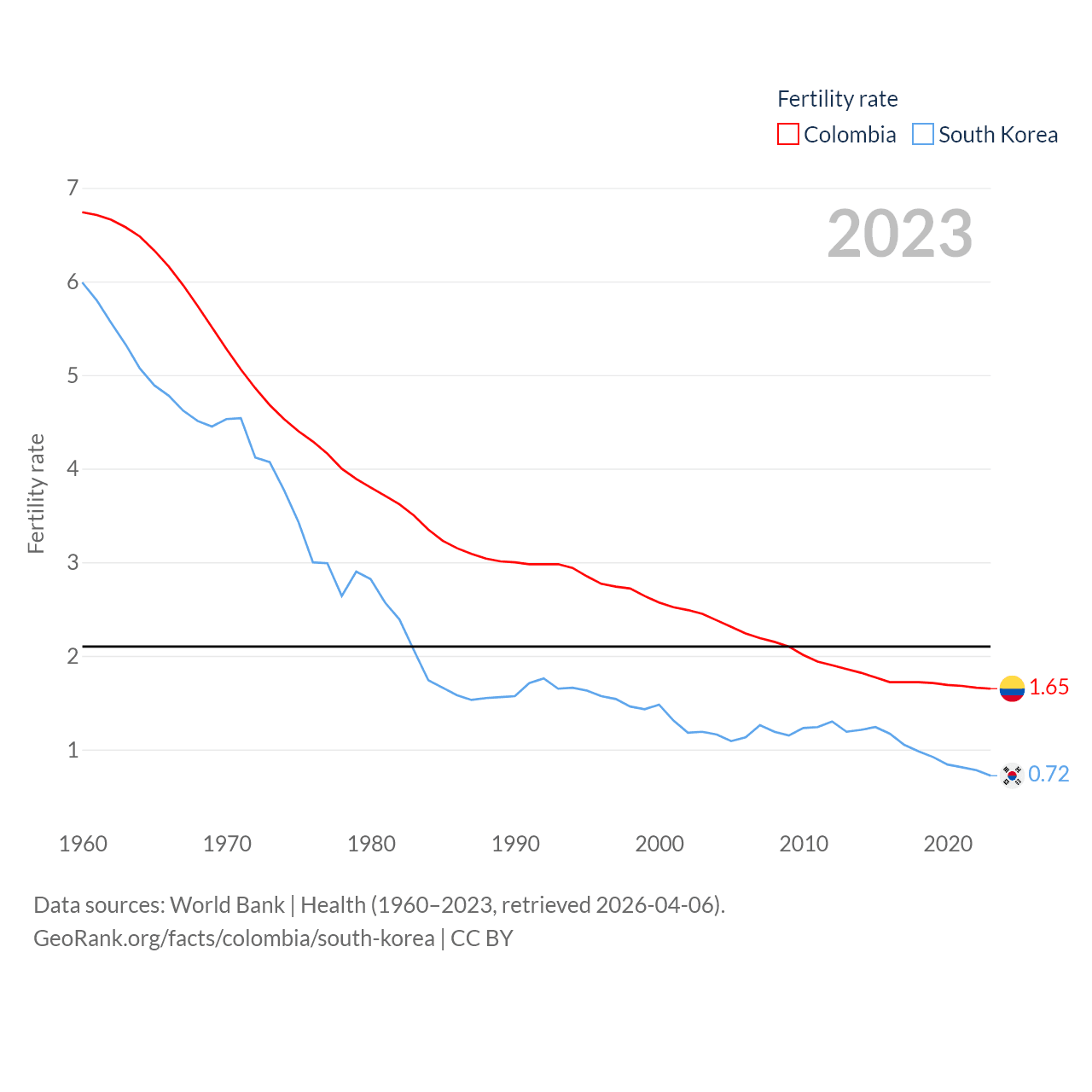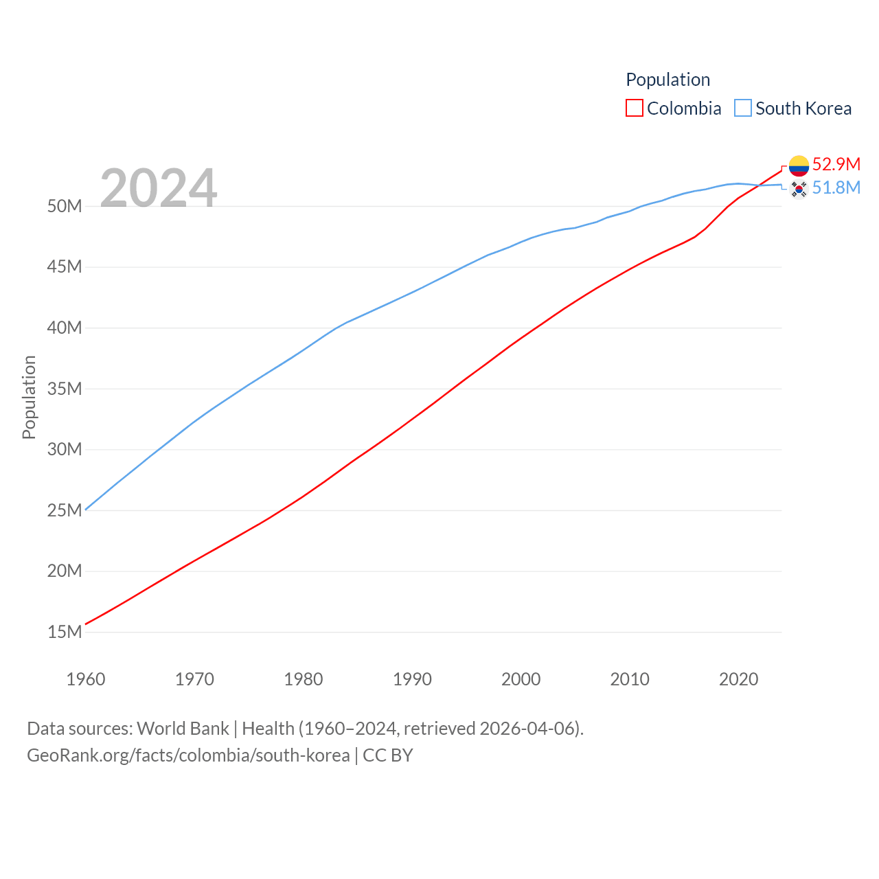 Colombia has a population of 52.9M (ranked 28/197), compared with 51.8M in South Korea (ranked 29/197). Colombia's land area is 428,380 sq mi versus 37,684 sq mi for South Korea (ranked 26th vs. 105th).