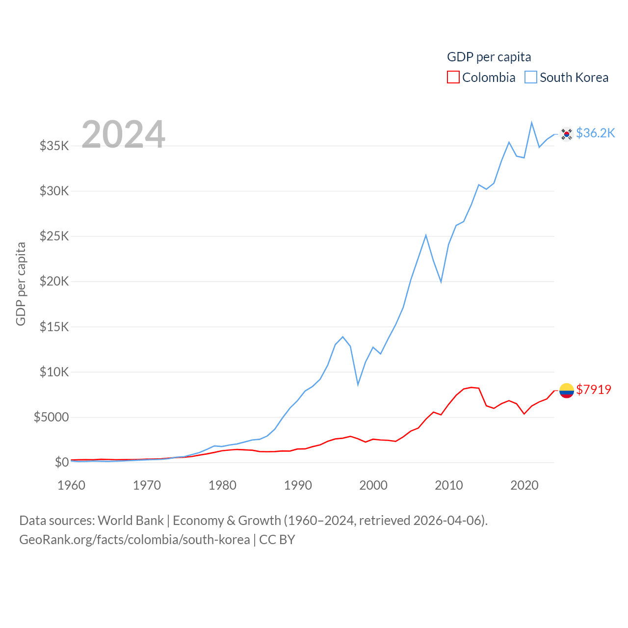 By GDP, Colombia ranks 39/197 ($419B) and South Korea ranks 12/197 ($1.88T). By GDP per capita, Colombia ranks 94/197 ($7,919), while South Korea ranks 31/197 ($36,239).