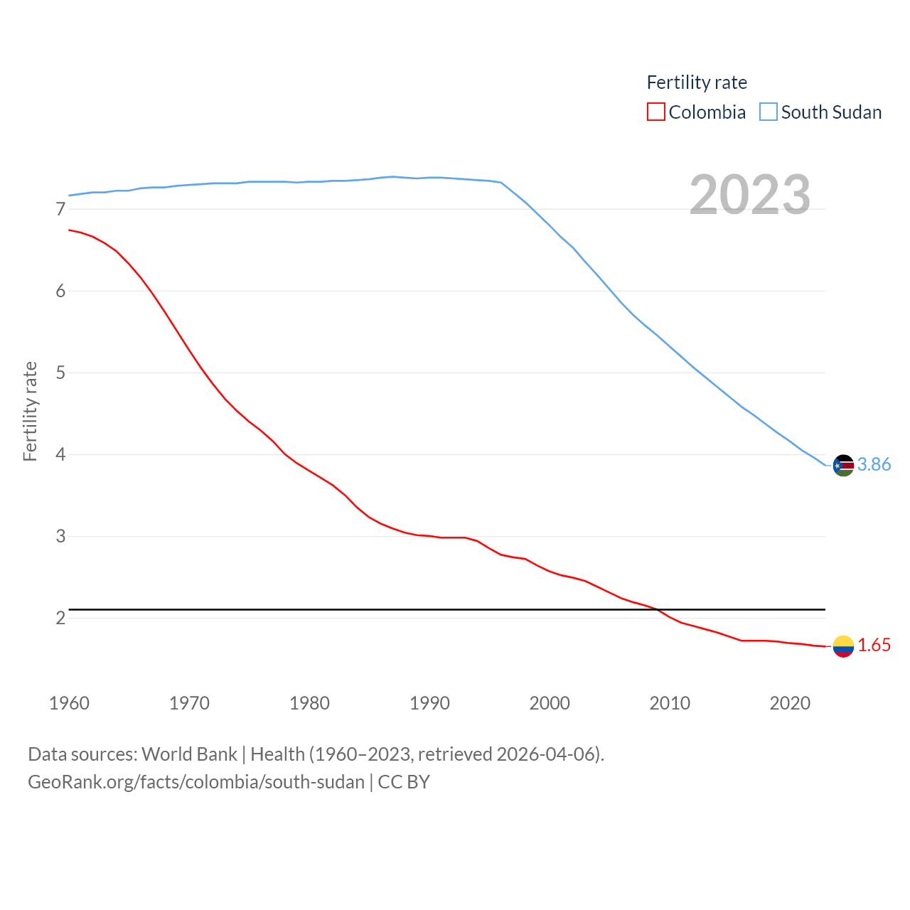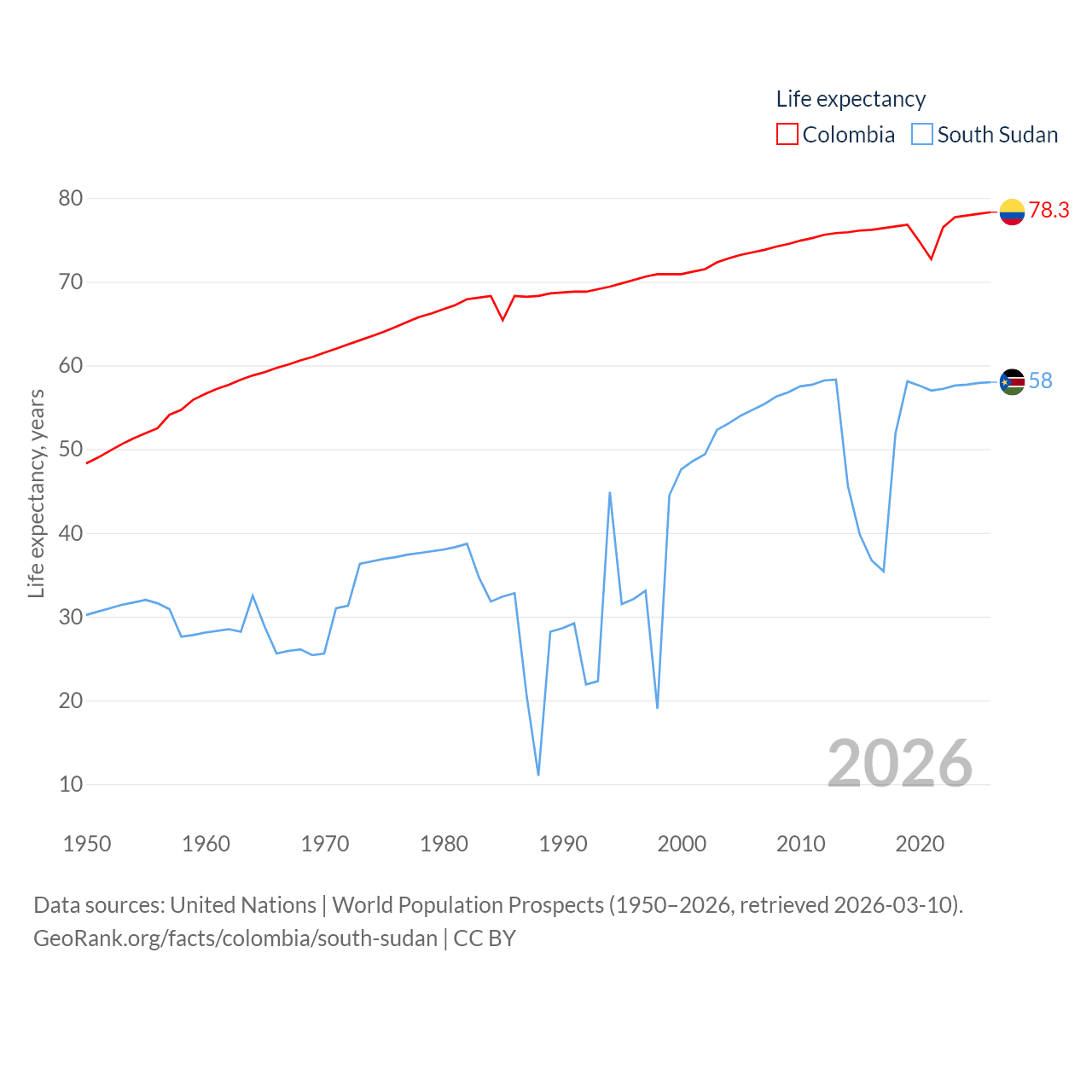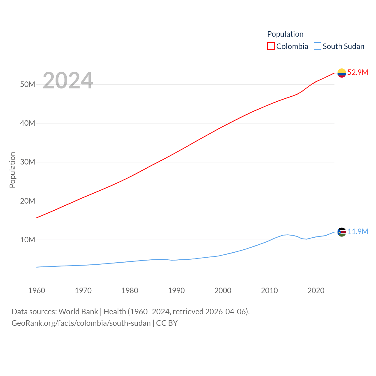 Colombia has a population of 52.9M (ranked 28/197), compared with 11.9M in South Sudan (ranked 81/197). Colombia's land area is 428,380 sq mi versus 243,990 sq mi for South Sudan (ranked 26th vs. 41st).