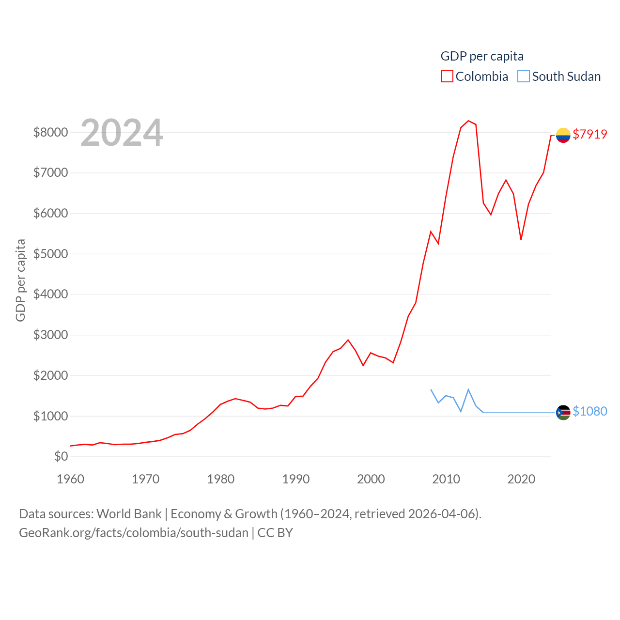 By GDP, Colombia ranks 39/197 ($419B) and South Sudan ranks 149/197 ($12B). By GDP per capita, Colombia ranks 94/197 ($7,919), while South Sudan ranks 175/197 ($1,080).