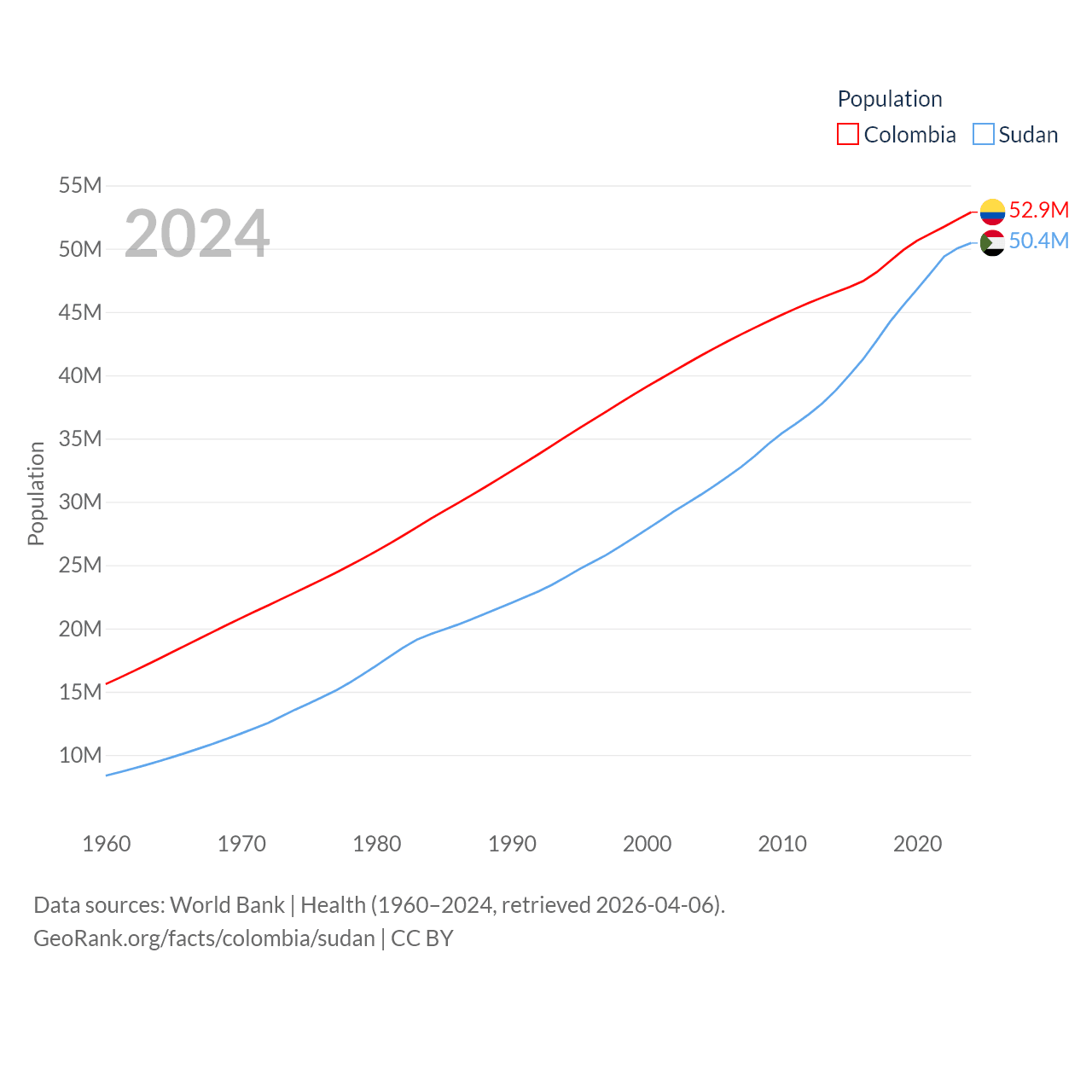 Colombia has a population of 52.9M (ranked 28/197), compared with 50.4M in Sudan (ranked 30/197). Colombia's land area is 428,380 sq mi versus 721,239 sq mi for Sudan (ranked 26th vs. 15th).