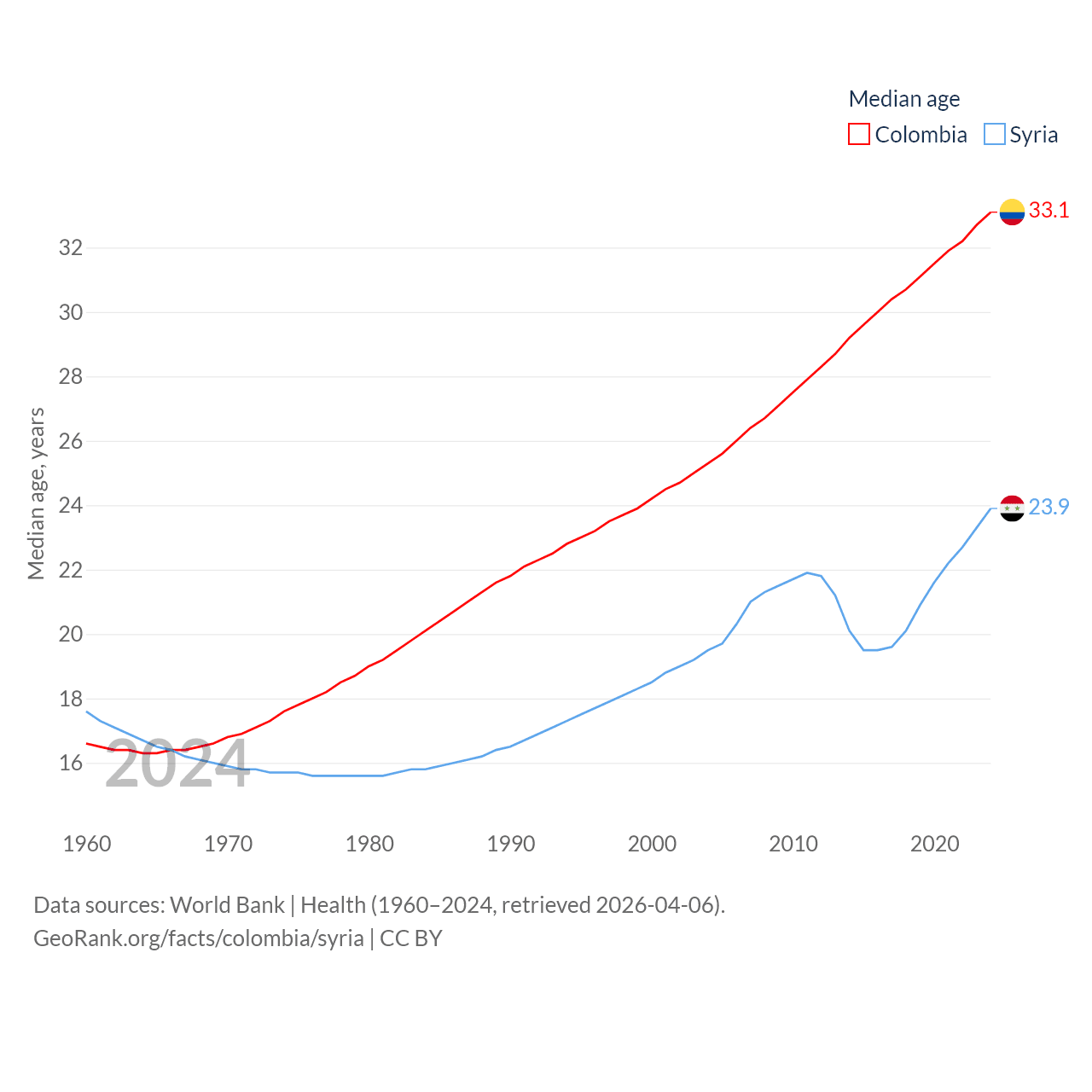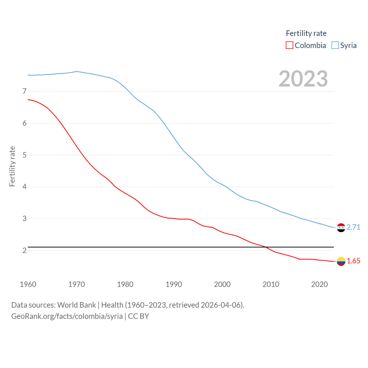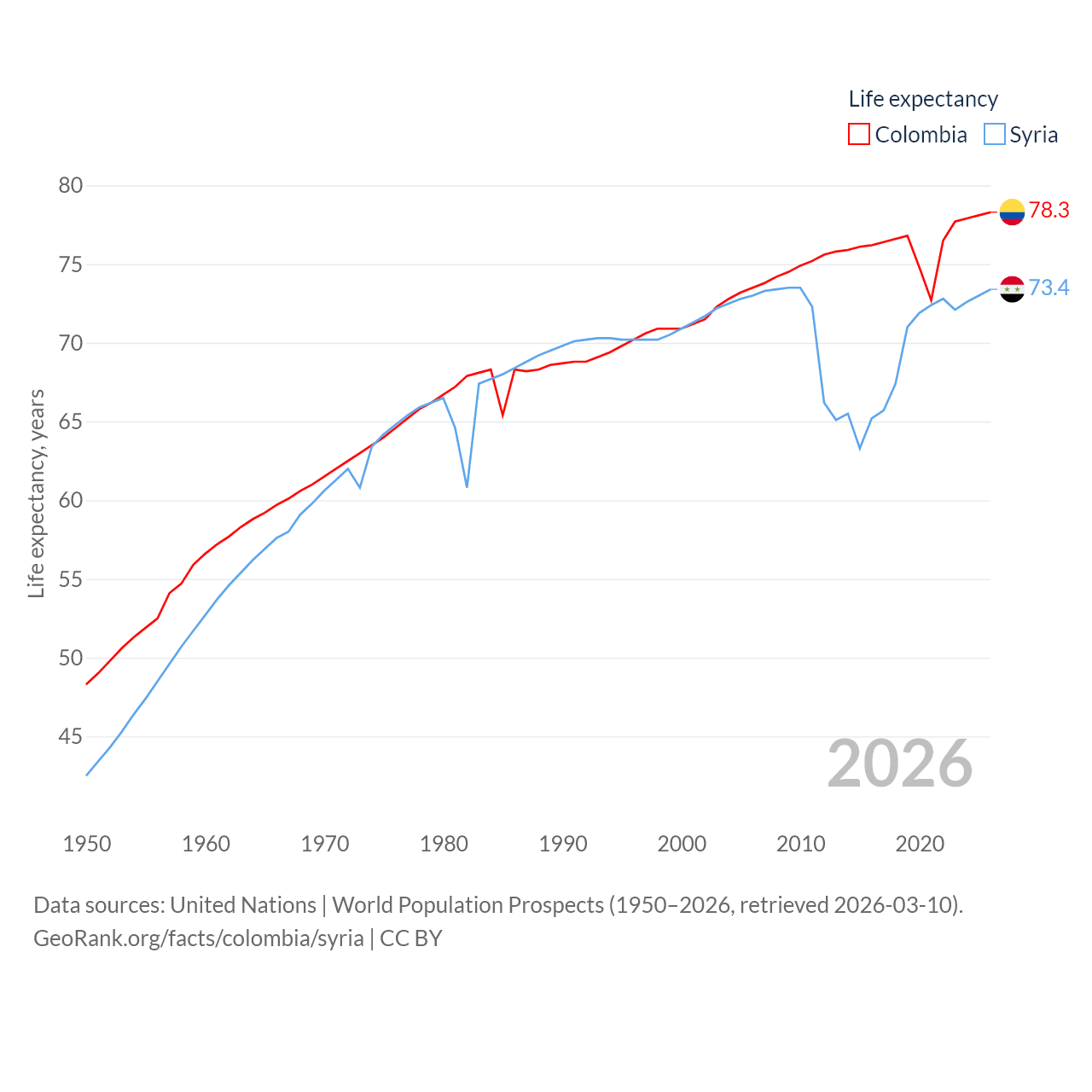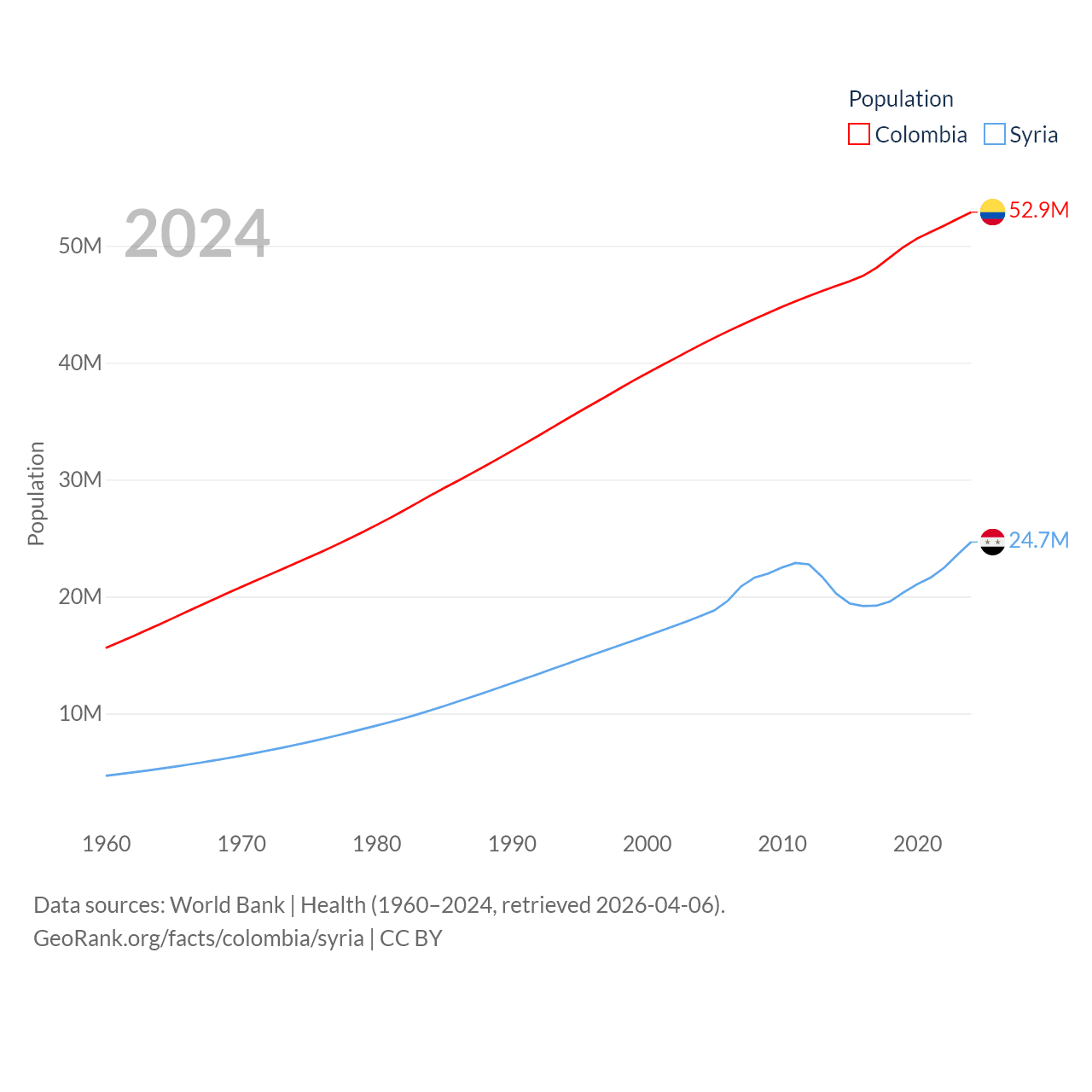 Colombia has a population of 52.9M (ranked 28/197), compared with 24.7M in Syria (ranked 57/197). Colombia's land area is 428,380 sq mi versus 70,900 sq mi for Syria (ranked 26th vs. 87th).