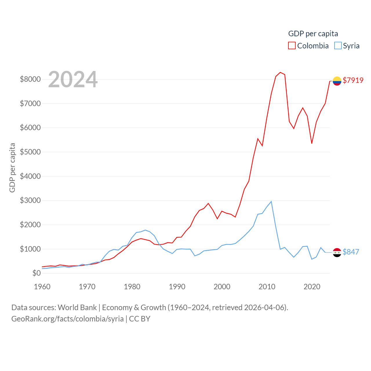 By GDP, Colombia ranks 39/197 ($419B) and Syria ranks 129/197 ($20B). By GDP per capita, Colombia ranks 94/197 ($7,919), while Syria ranks 185/197 ($847).